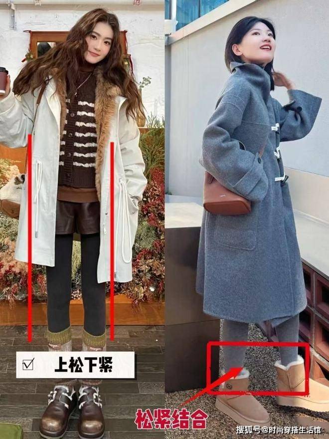我们可以选择搭配大衣、羊羔毛、羽绒服这些大灵感的外套,下身选择搭配紧身裤从而通过上窄下窄的搭配方式来平衡造型的层次感,完美优化出三七分比例,视觉上显高显腿长。