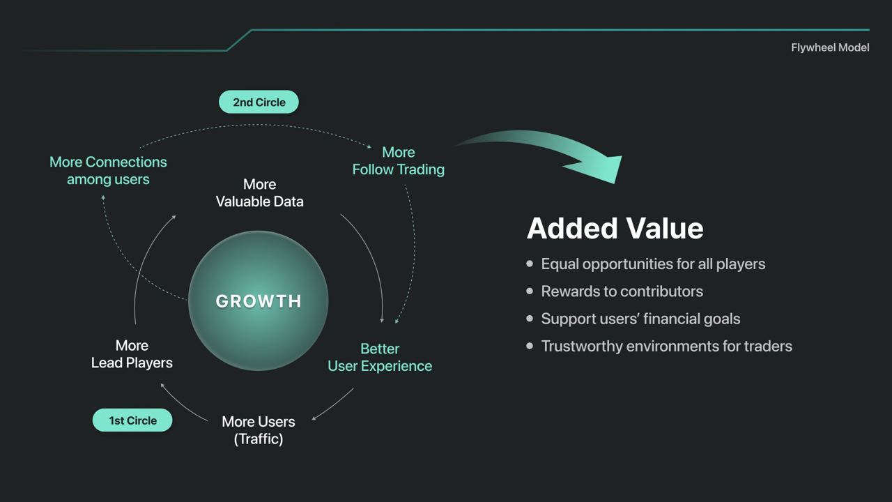 吸引巨大用户参与的关键在于一个增长飞轮模型。在飞轮的第一层,初始用户增长和不断推出的奖励活动帮助更专业的玩家脱颖而出,产生更全面和有价值的数据。在飞轮的第二层,当专家推举系统稳定下来后,专家的意见和带单效应开始显现,刺激更多用户进行跟随交易,进一步提升和完善用户体验和平台数据的专业性。