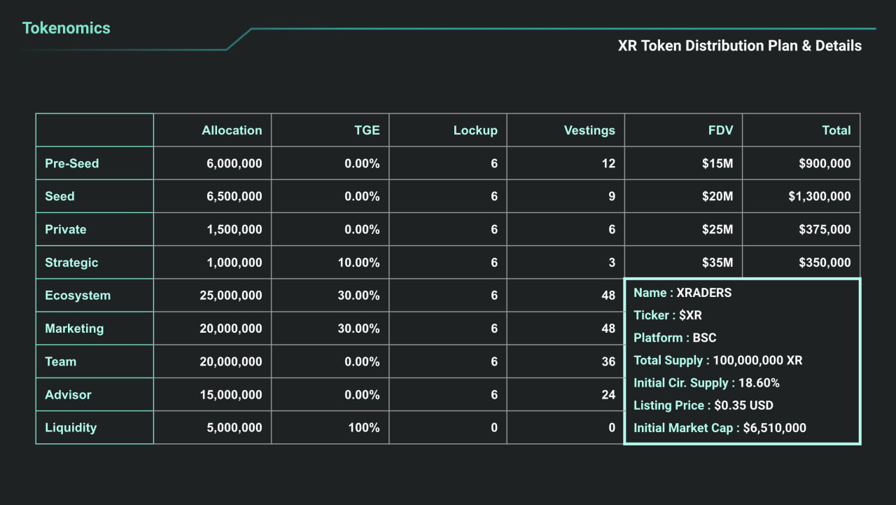 据官方介绍,2024年7月XRADERS的治理代币$XR即将上线。$XR发行总量为1亿枚,在如今动辄百亿、千亿枚发行量的时代,这实属罕见。据XRADERS介绍,除了增强平台上的游戏体验之外,$XR代币还具有三个关键功能:促进社区参与、促进治理运营以及为XRADERS环境中的用户提供支持。$XR计划在BSC链上发行,初始供应量为18.6%,发行价格为0.35美元,预计的初始市值约为651万美元。