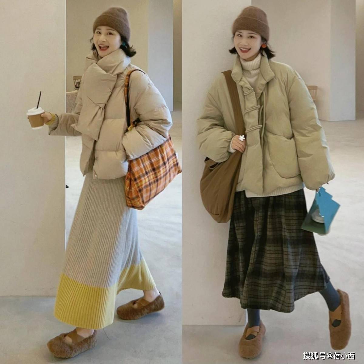 搭配的时候,记得“上短下长”的原则,用短款羽绒服配高腰半身裙,悄悄把腰线提起来,哪怕是小个子姐妹,也不会显得压身高。