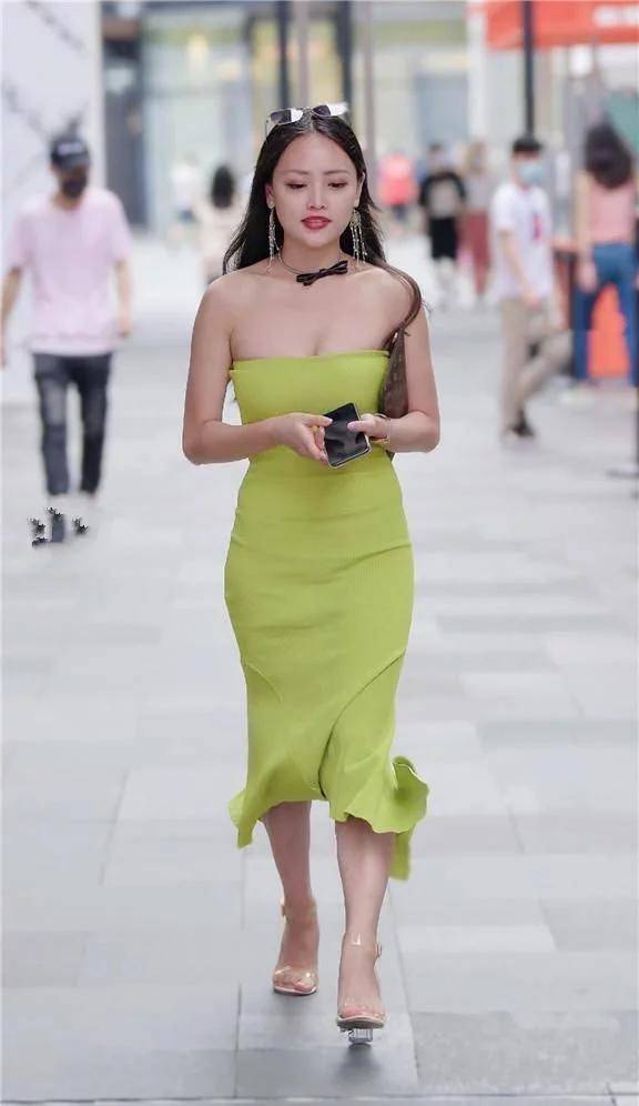今天街拍小姐姐穿着的是一件嫩绿色的抹胸连衣裙,这件裙子看到后的第一反应就是视觉冲击力太强烈,这种嫩绿色的连衣裙还是很少有人穿着的,所以比起那些红色蓝色黄色的衣服,更具有独特性,这款绿色更像是小草还冒出尖尖的样子,不张扬但是能让人忍不住多看几眼,再配合裙子的整体剪裁设计,吸睛十足。