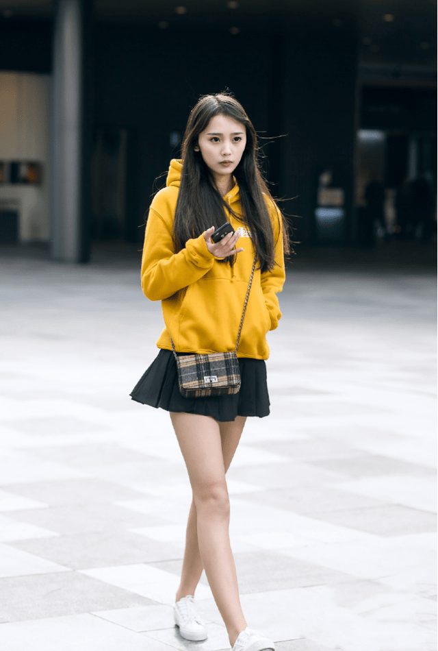 在这个季节我们在衣服配色的选择上也是需要注意很多东西,比如太花色的衣服需要谨慎搭配,并非越多配色就能实现多变的搭配风格。其次层次感也是我们一直强调的关键因素。像这个小姐姐选择的搭配就十分的正确,在上半身上是一件深黄色的连帽卫衣,不知道大家有没有和小编一样的感觉,这种配色的连帽卫衣在秋天仿佛十分合适。