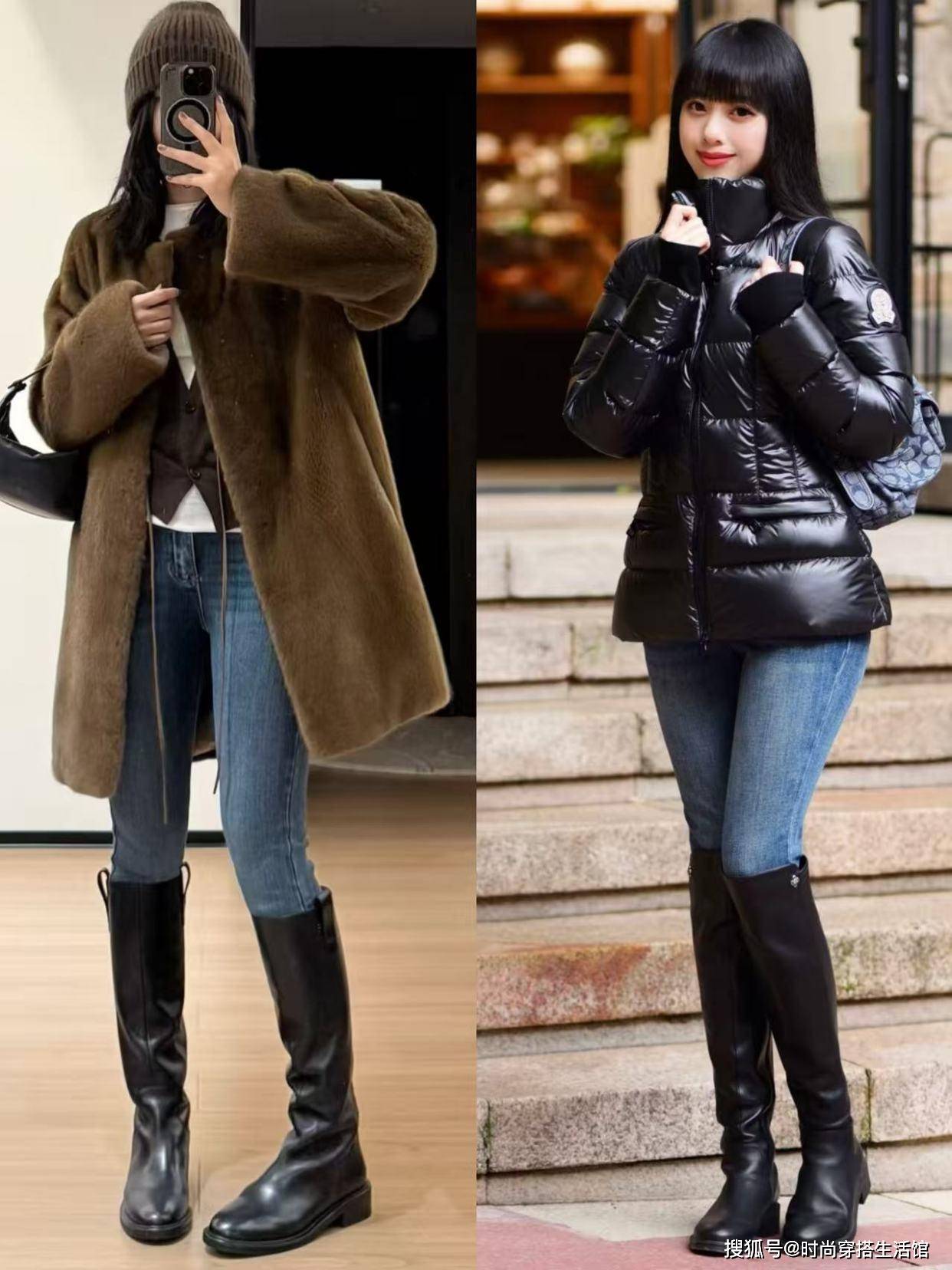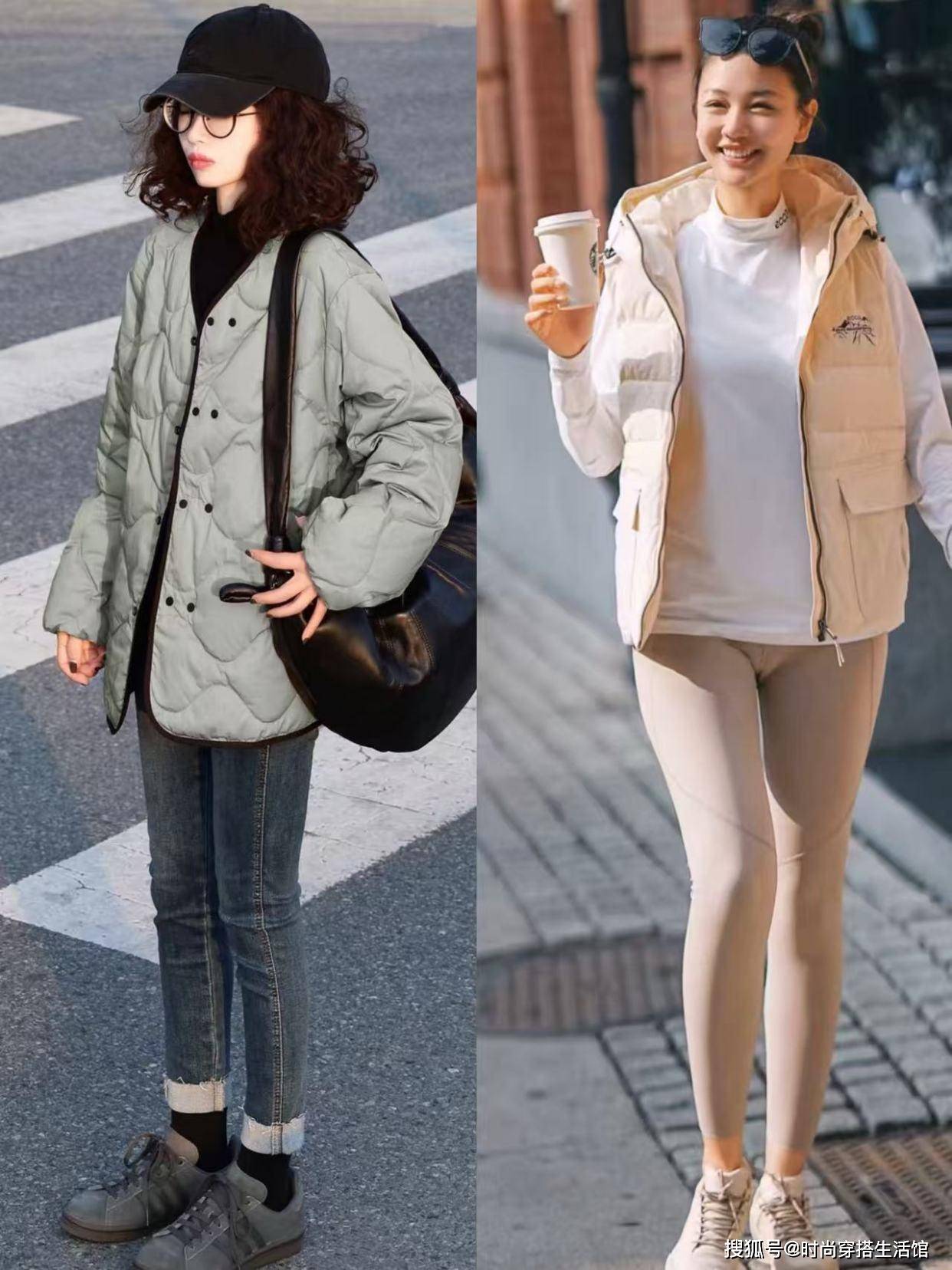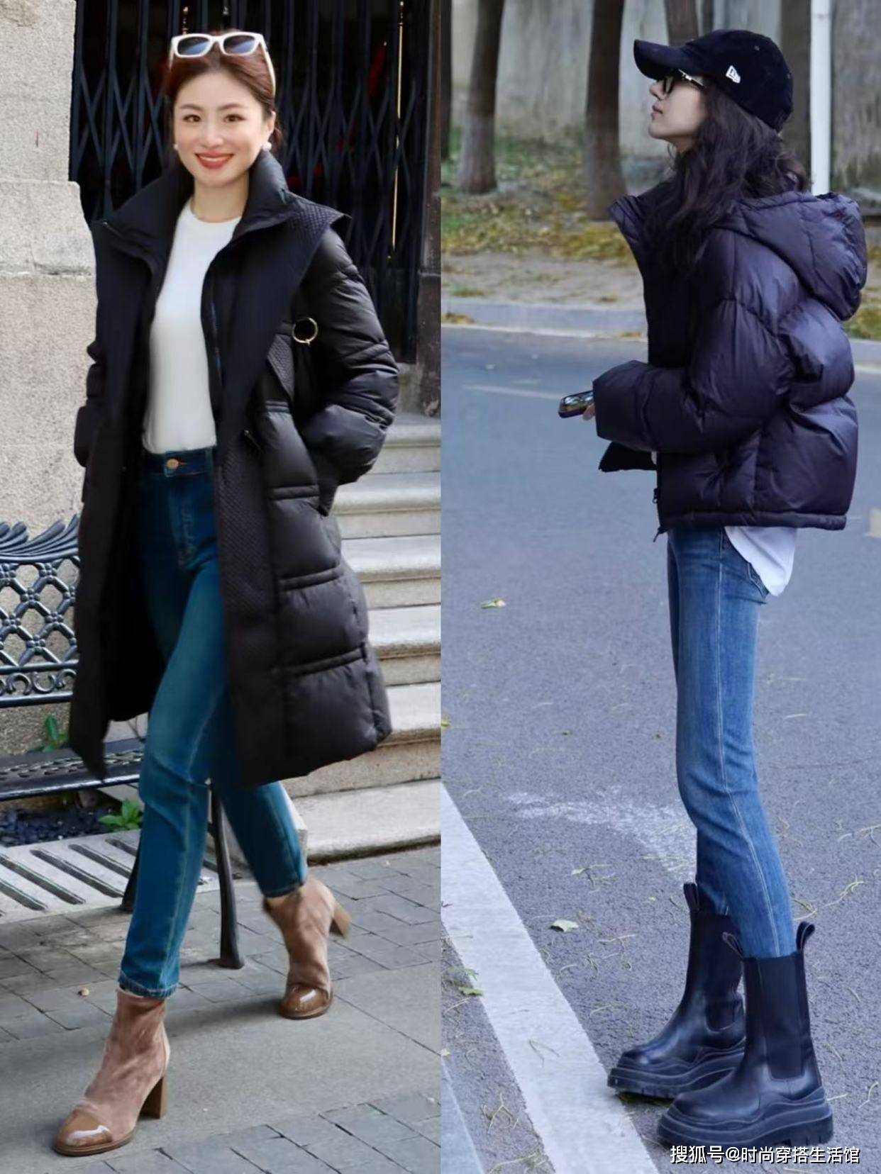 对于冬天来说我们选择宽松的外套搭配瘦瘦裤的时候,像是最常见的羽绒服、廓形大衣、羊羔毛等等,我们可以借助下半身“瘦瘦裤”来削弱上半身的臃肿感,从而形成对比更显瘦。