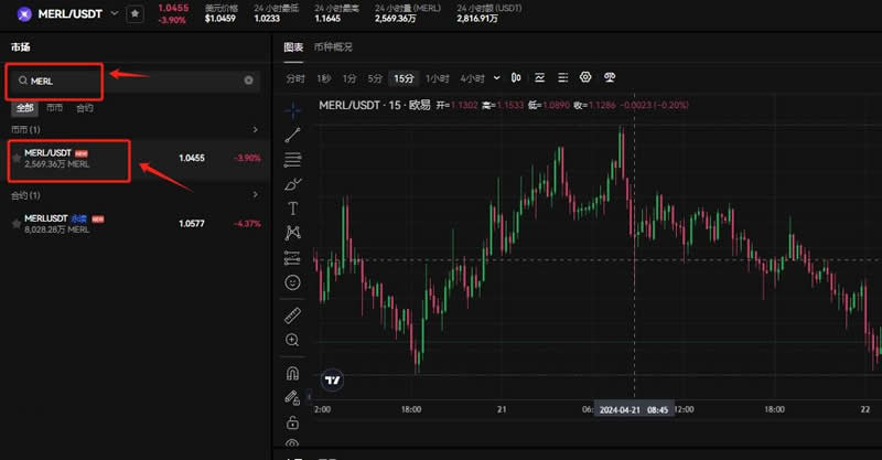 11、在搜索框输入MERL,选择MERL/USDT交易对,即可查看MERL的实时行情。