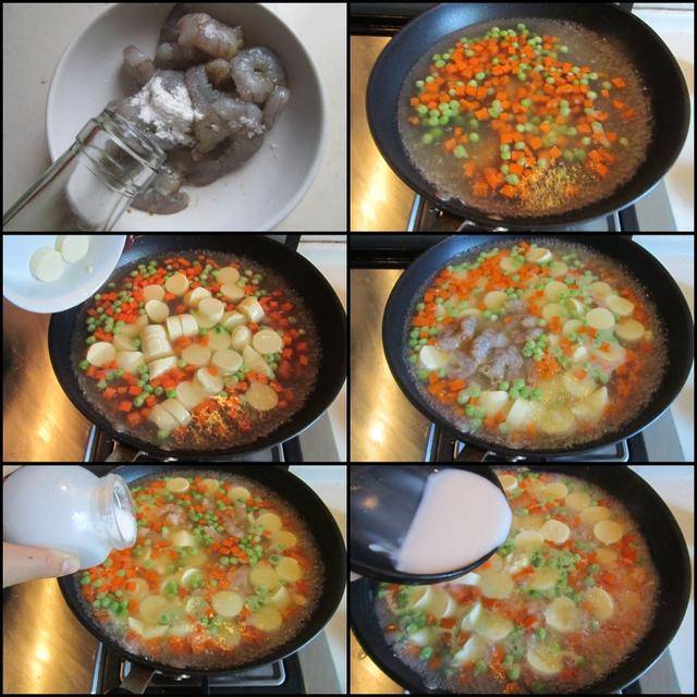 制作过程: 将鲜虾去壳后挑出虾线,冲洗干净后挤干水分,加入少许盐、淀粉、料酒和姜末等调味料拌均匀腌制3分钟备用;将日本豆腐切成小块,胡萝卜去皮后切成小丁备用。 烧热锅放入少许油, 将豌豆和胡萝卜丁放进锅中翻炒几下,加入适量的水炖煮, 大火煮开后加入日本豆腐块一起煮上2分钟,再放入腌制好的虾仁放进锅中去煮至变色,加入少许盐和胡椒粉调味,最后放入少许水淀粉勾芡即可。