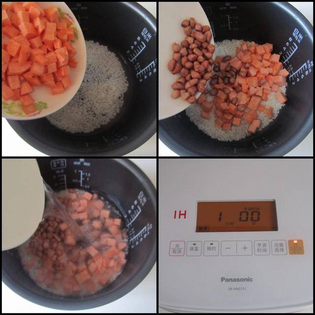 制作过程: 将花生米洗净备用; 红薯去皮后切成小丁; 将糯米和梗米混合洗净备用。 将红薯丁和糯米和粳米放入电饭煲中,加入洗净的花生米,再加入适量的水,按下电饭煲上炖煮粥的功能键,时间到,“花生红薯粥” 就制作好了。