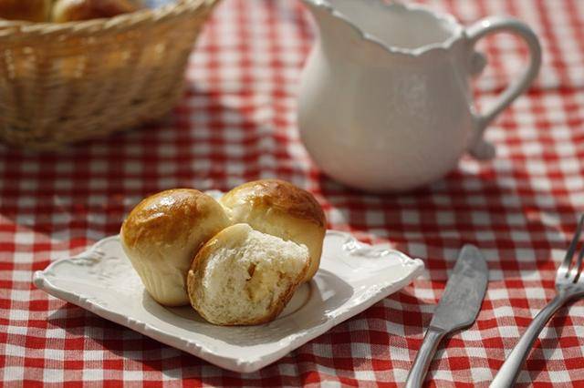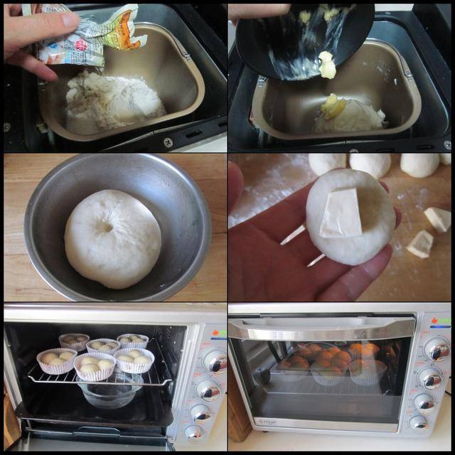 制作过程: 先所有材料除了黄油和奶酪外都放入面包机,选择和面程序,揉面15-20分钟;再加入黄油, 重新启动揉面程序;面团揉好后放入盆中,再盖上一层保鲜膜,室温下发酵约2.5-3倍大小。将面团按压排气,将面团分成六等份,滚圆后盖上保鲜膜松弛15分钟;再取一小块面团,将其擀成圆片,中间包入一小块奶酪,将其包裹紧后放入纸模具中。 将烤箱旋钮至发酵档,烤网上放一碗开水,再放入下面的烤盘,进行最后发酵, 约30分钟;发酵好的面包和烤网上水取出, 在面包上涂上一层鸡蛋液; 烤箱180℃预热,中下层,上下火,烤15-18分钟即可。