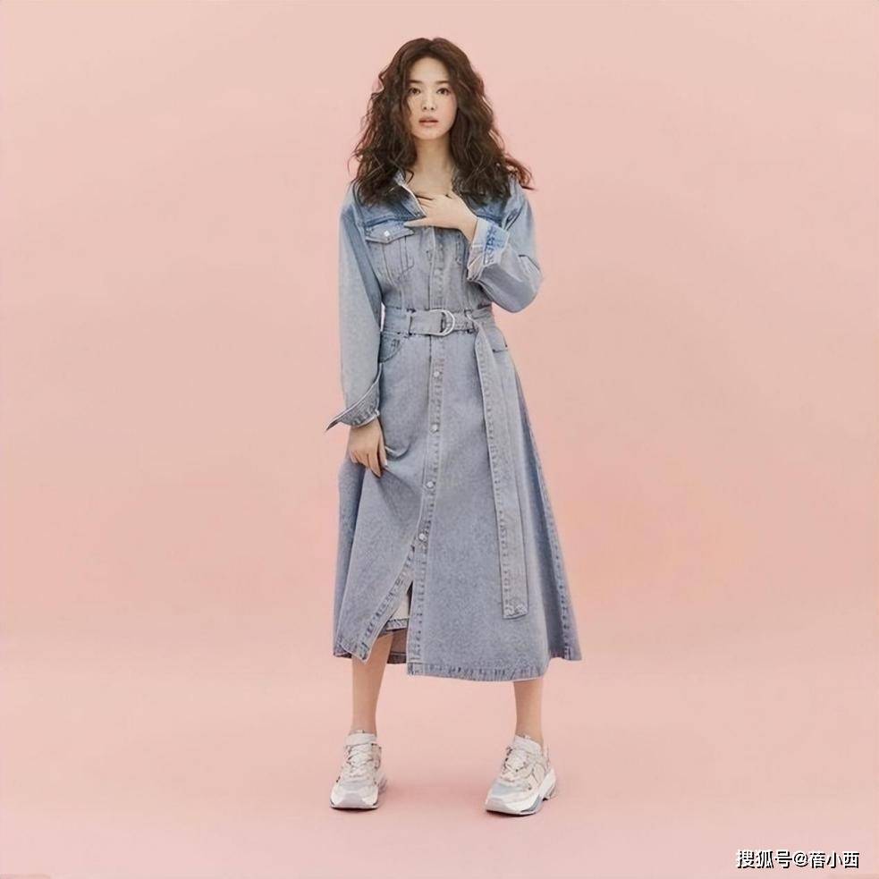 牛仔面料的连衣裙时尚感爆棚,身上这件门襟采用了扣子设计,为了彰显纤细腰肢,特意搭了一款同面料的腰带。牛仔裙在搭配鞋子上选择面很广,比如一脚蹬、运动鞋都很合适。