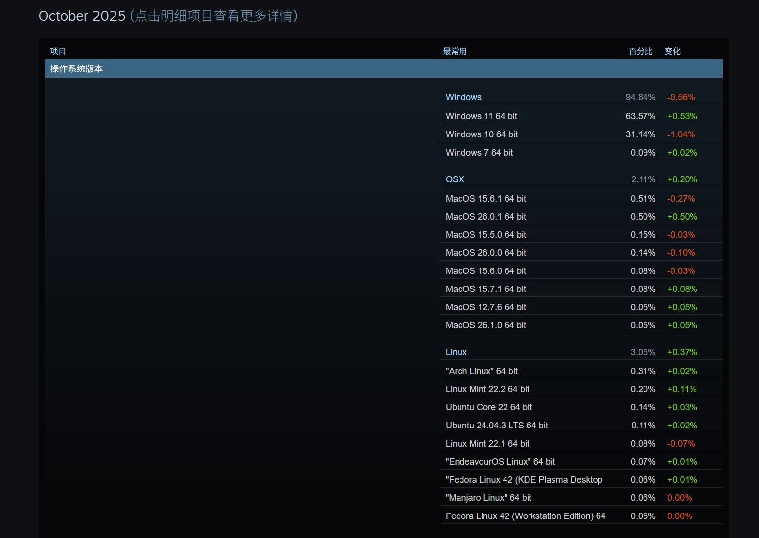 而Steam Deck的成功,不仅在于其硬件销量,更在于它成功撕开了由Windows主导的PC游戏生态的一角——根据 Valve 的 Steam 硬件与软件调查,Linux 在 2025 年 10 月的占比突破了 3%(约 3.05%),已超过 macOS 成为调查样本中的第二大操作系统。