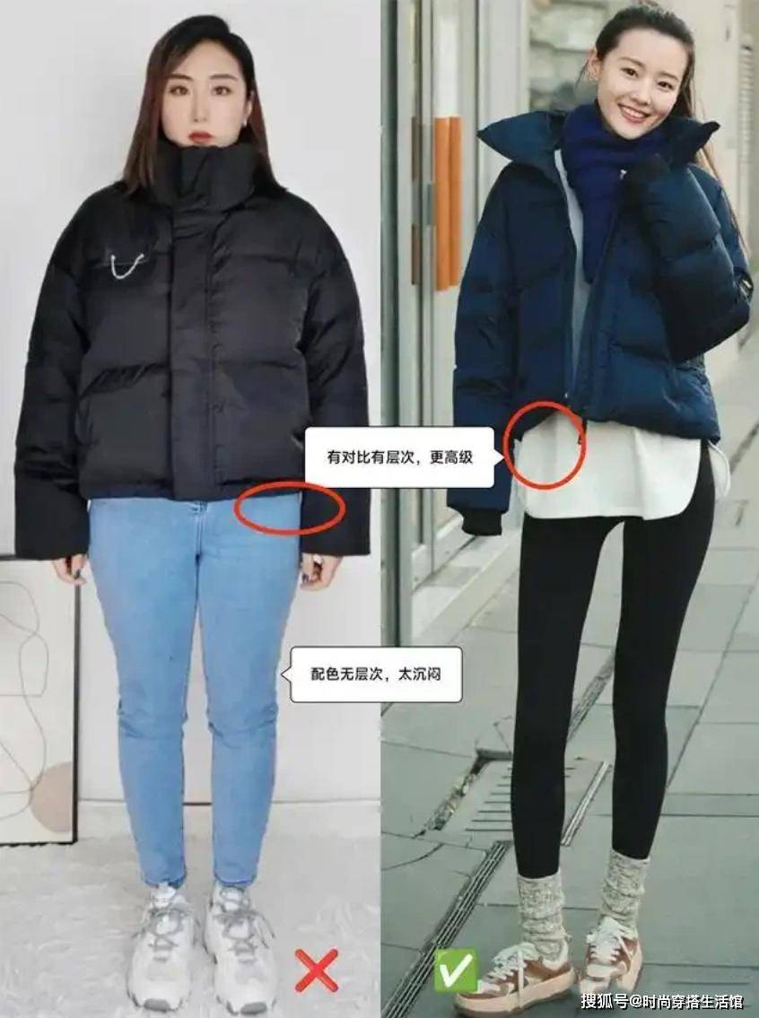 最后挑选羽绒服的时候还要挑选合适的颜色,毕竟选对颜色穿搭的话看起来才高级显白,穿错颜色瞬间就显老10岁,我们看上图就可以知道了,选择深色穿搭视觉上会显得沉闷和老气,我们选择有对比的色彩,上下之间能够相互对比,视觉上看起来更高级,完全不用担心会暴露肤色。