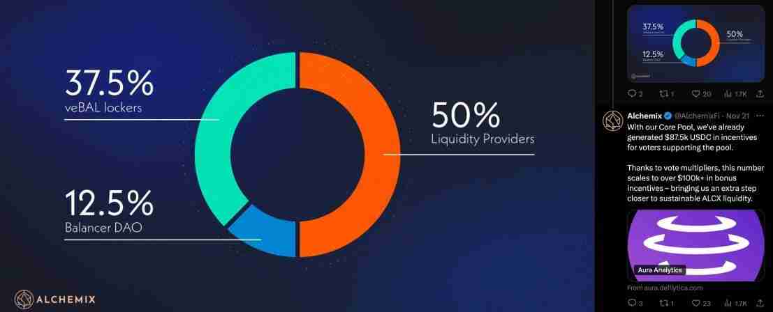 此外,ALCX/ETH 池的选民通过 80/20 Balancer 池费用分成方式,获得了 87.5 万美元的激励。这种激励方式将收益分配给流动性提供者、DAO 组织和 veBAL lockers。