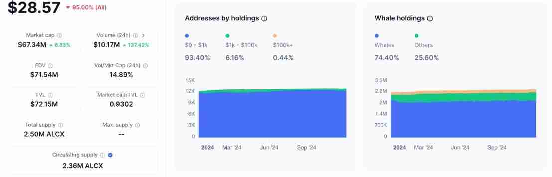 极少的巨鲸持有了超过七成的 ALCX 代币资产,这意味着价格可能会被轻易操控。