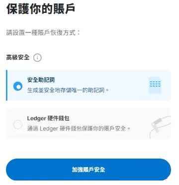 密码设置好之后,下一步就是选择未来恢复账户的方式。你会看到几个选项,比如使用硬件设备。如果你手边没有像Ledger这样的硬件设备,那就毫不犹豫地选择“助记词”选项吧。请务必记住,助记词就是你账户的“灵魂”,它的重要性等同于你的私钥,所以一定要妥善、安全地备份好。
