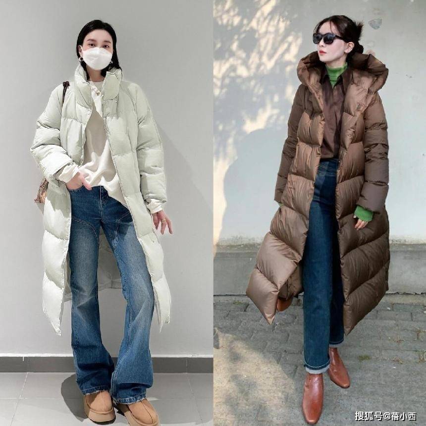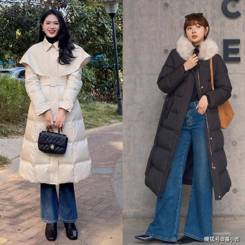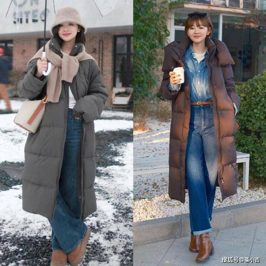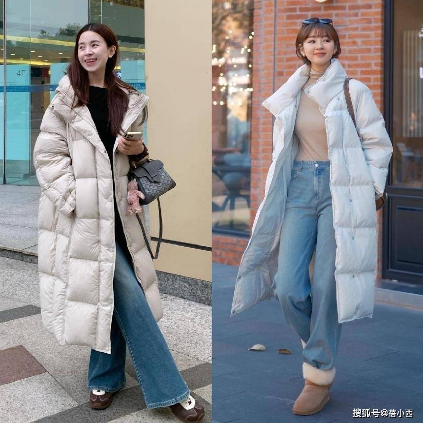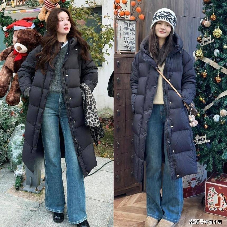 长款羽绒服+牛仔裤,是永不过时的休闲风组合,主打利落清爽,又能兼顾温柔与元气,适合大多数日常场景。这一组搭配的关键的是“优化比例”,避免长款羽绒服压身高,推荐姐妹们优先选择高腰直筒牛仔裤或微喇牛仔裤,高腰设计能拉高腰线,优化三七分身材比例,让双腿看起来更修长。