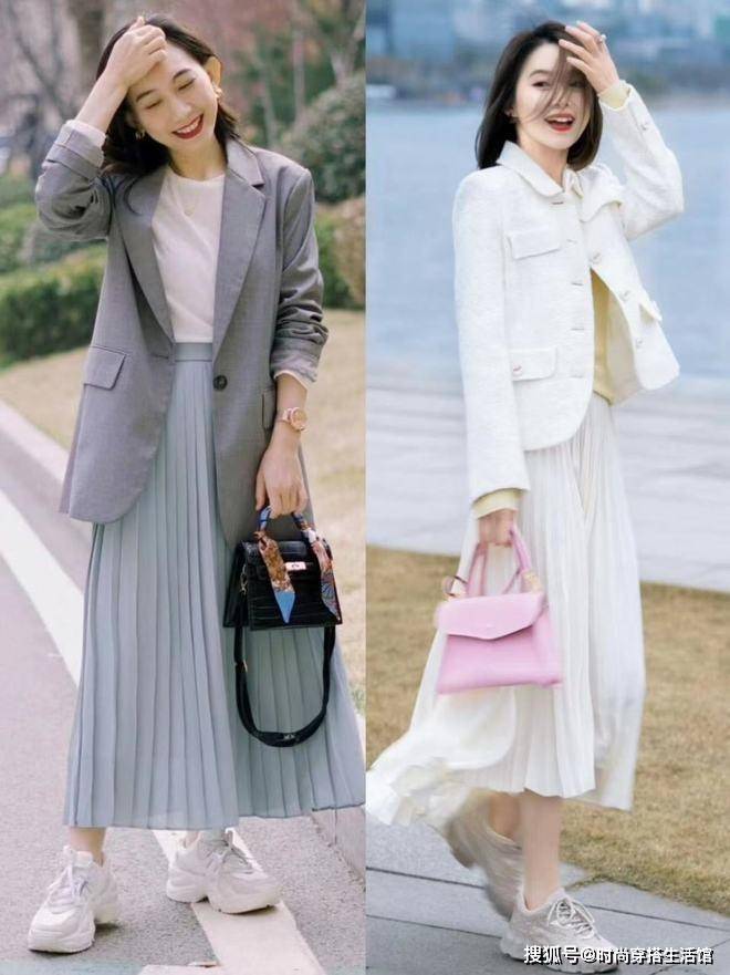 那么为了保险起见的话,我们可以选择同色搭配,比如像是上衣和下装同色,或者是裙子和外套相同不仅能够凸显出整个造型的高级感,同时还能延长下半身的比例感。