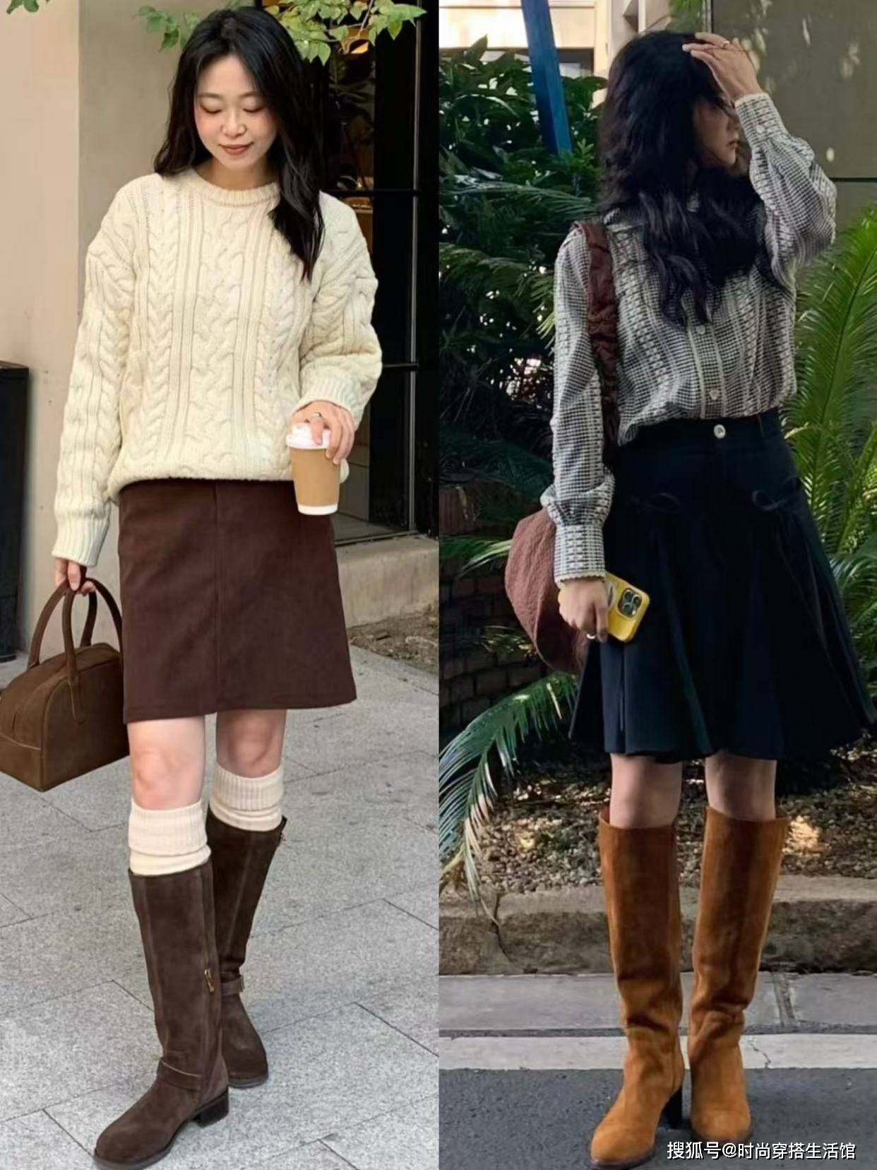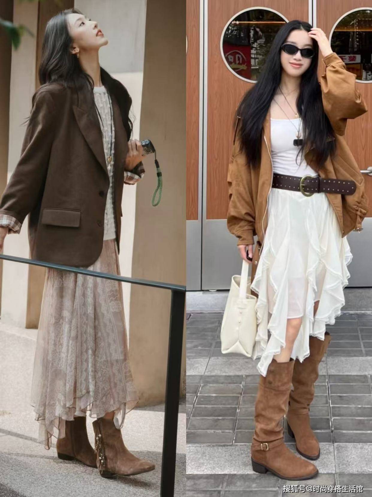 此外我们穿麂皮靴怎么能少了裙子呢。对于中年女性来说我们挑选过膝不过踝的长度,能够适当露出纤细的脚踝完全不用担心会压低整体造型,其次我们还要注意选择高腰的款式,一方面可以完美的提升腰线,另外一方面还可以将上衣塞进裙腰,轻松就可以勾勒出小蛮腰,脚上搭配上麂皮靴,更显高显腿长。