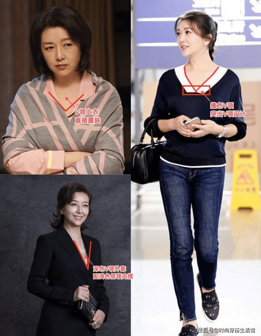因此,江珊在日常穿搭中,全部是以“简单、大方”的“基础款单品”为主。在版型上,也是以“V领”设计为主。基础款单品穿在身上本身给人简单的视觉感,而V领设计则可以修饰脸型、修饰脖子曲线,从而显瘦显脸小,也可以达到显年轻的视觉效果。