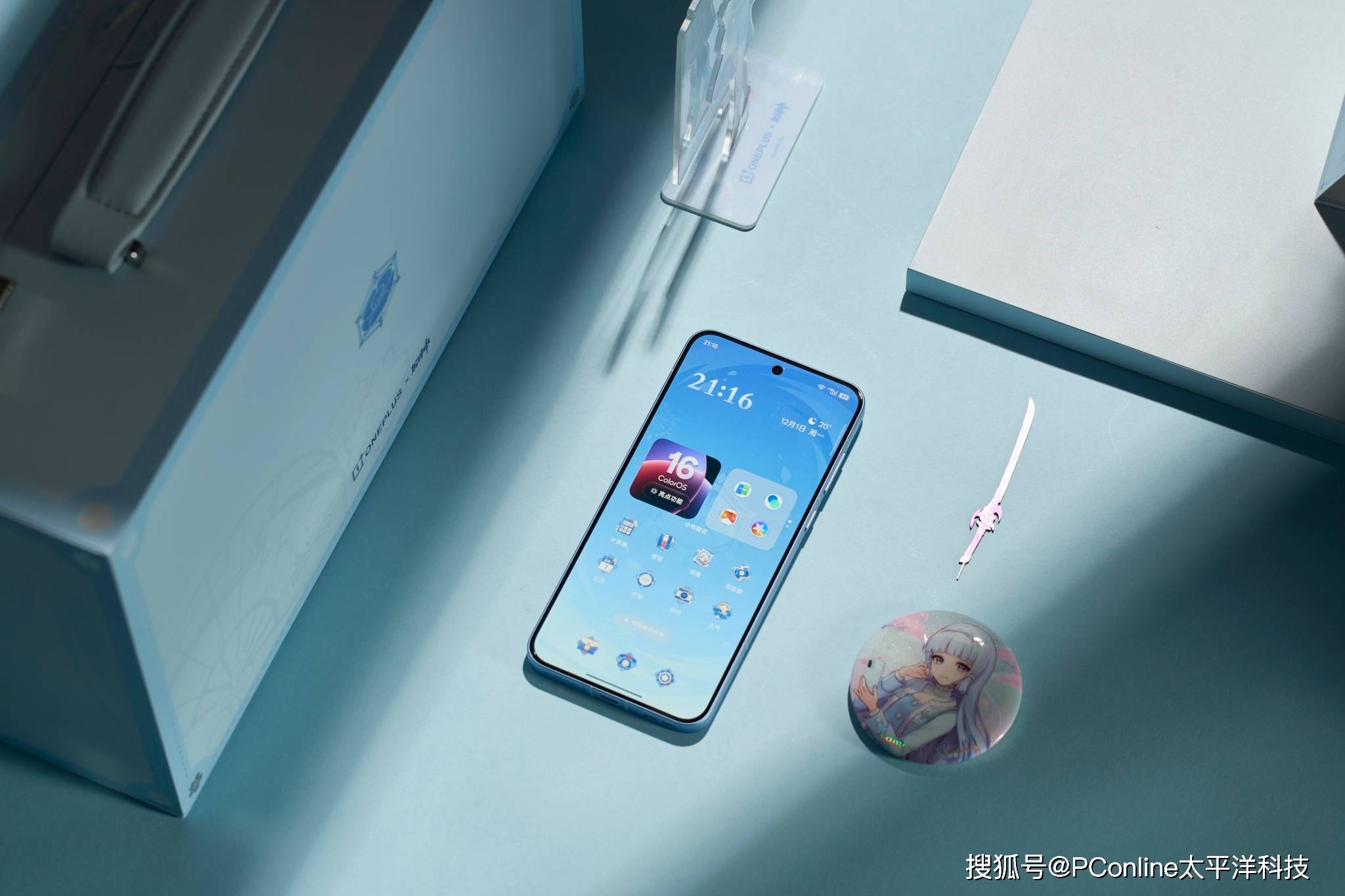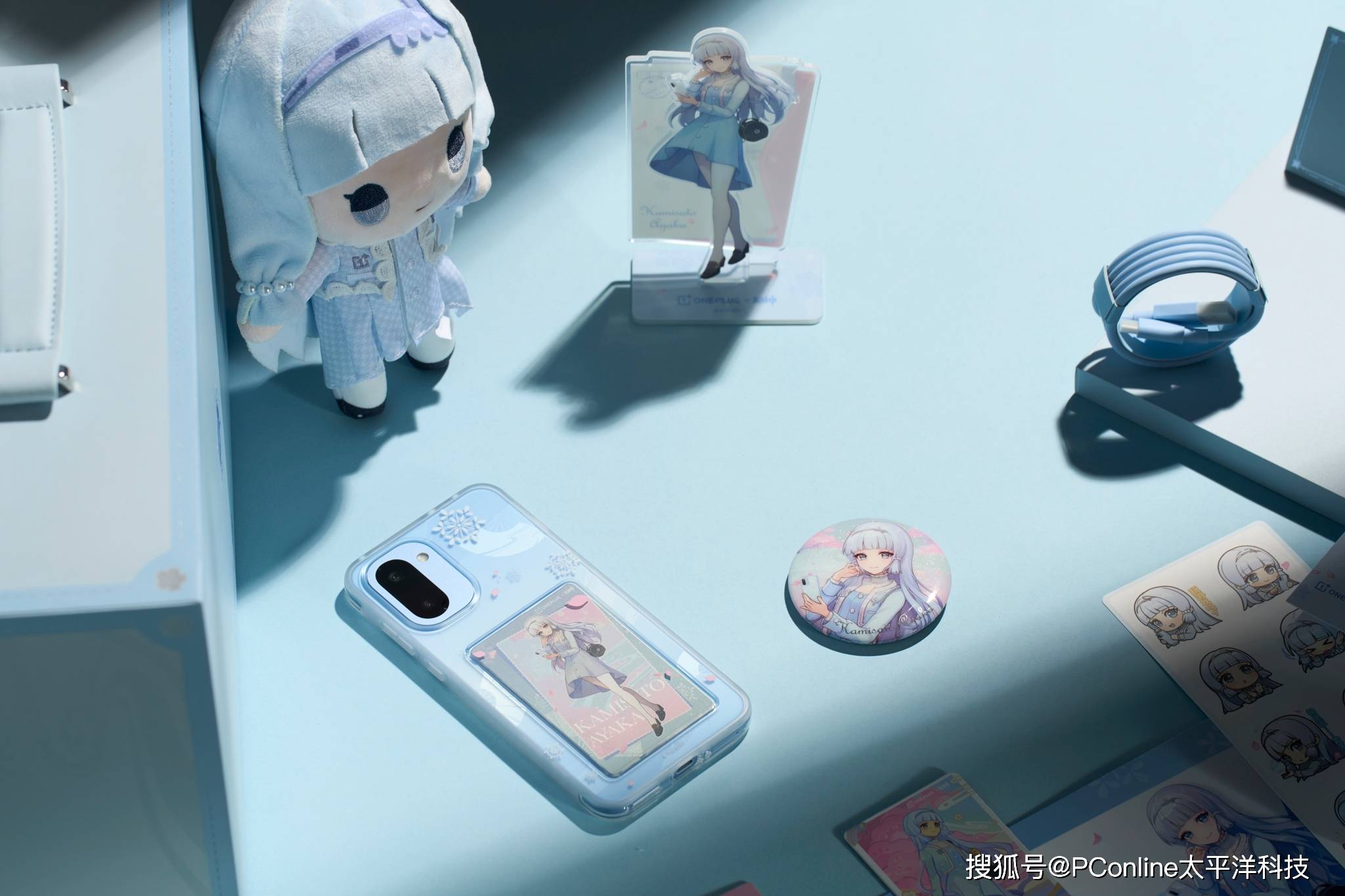 机身色彩定格雪后初晴的「雪霁蓝」,浅蓝釉色中透出微光。背盖之上,绫华的独特印记与折扇、霜华纹路精巧交织,每一笔都似凝有寒露。玻璃工艺将月下剑舞的瞬时光影化为永恒——只需轻转角度,便有流波般的光泽在曲面间游走,宛若她挥剑时洒落的点点冰晶。握持于手,机身的温润弧度贴合掌心,清冷的视觉与细腻的触感奇妙交融。每次点亮屏幕,都似与白鹭公主完成一次月光下的共舞,让日常的每一次触碰,都成为对那份优雅与决绝的无声纪念。 此番意蕴更延展至丰富周边,雪霁蓝为主色调的定制周边可谓是诚意满满,巧思不断;打开专属礼盒,定制保护壳以半透霜纹覆盖原有纹样,若隐若现,在此基础上还可以加入角色小卡,“痛机”效果拉满了;不仅如此,这份精心打造的生态还延伸至每一处细节:专属的定制卡针、神里绫华主题的充电器与数据线,以及柔软的毛绒公仔与主题贴纸,均以统一的神里绫华美学贯穿,让幻想世界的陪伴无处不在。