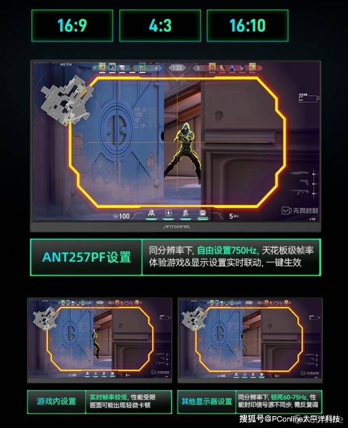 针对画面撕裂问题,ANT257PF除了使用新一代快速Fast TN面板以外,还内置了防撕裂技术,并兼容目前英伟达和AMD两家主流显卡的G-Sync和Free Sync技术,彻底杜绝画面撕裂问题和降低玩家键鼠的输入延迟,让每一次出击都随心而动。