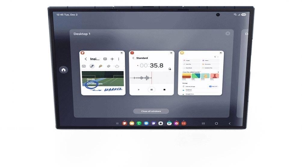借助10英寸展开面积,Galaxy Z TriFold也成为首款支持“独立版Samsung DeX”的手机,无需连接显示器即可直接进入桌面级界面,打造真正意义上的移动办公终端。机身厚度同样控制得极为激进:展开后最薄处仅3.9mm,中央区域4.2mm,侧键处4.0mm,全机重量为309克。外屏覆盖康宁大猩猩陶瓷玻璃2,机身辅以装甲铝和钛合金铰链,还通过了IP48防护等级认证。