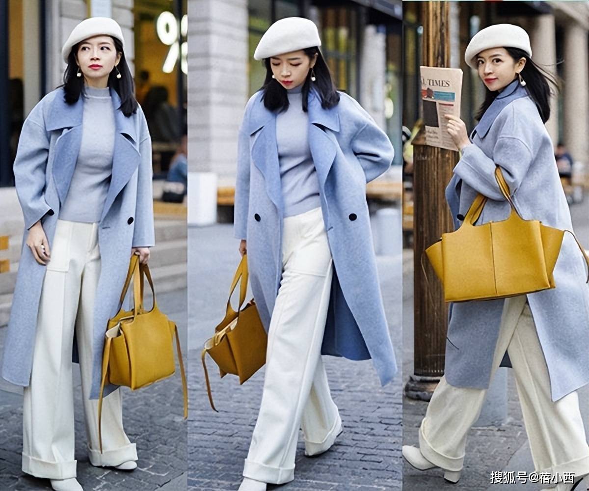 大衣和阔腿裤的版型都比较宽松,内搭如果太花哨,会显得整体很臃肿,没有重点。内搭一定要选简约精致的,颜色选和大衣、阔腿裤相呼应的,这样整体穿搭才会更协调,比如浅蓝色大衣搭配浅蓝色打底衫,同色呼应更高级。