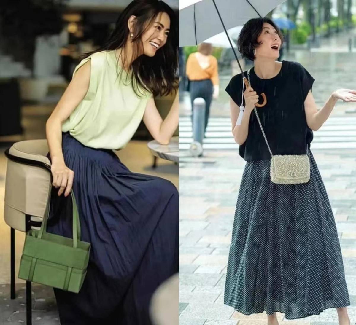 比如这两条过膝半身裙,它们在色彩方面的演绎其实有着相似之处,都属于偏深的色系。而在后续的服装结合方面,大家也有不一样的灵感。可以驾驭同样颜色有一点朴素的上衣,可以穿上彩色服饰,让整个颜色的碰撞更有活力。