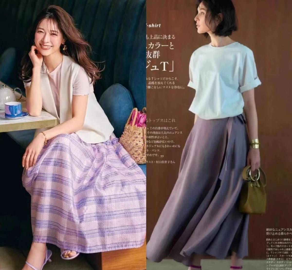 淡淡的紫色过膝半身裙,如果加入了T恤和它配合,就会维持着偏自然的穿衣方案。