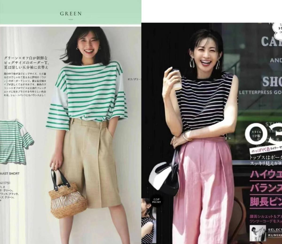 比如这件绿色的圆领T恤,它是设计简约的类型,不涵盖过多繁杂的元素,下半身可以驾驭条纹裙,以白色和蓝色的填充为主,不会显得太花哨。