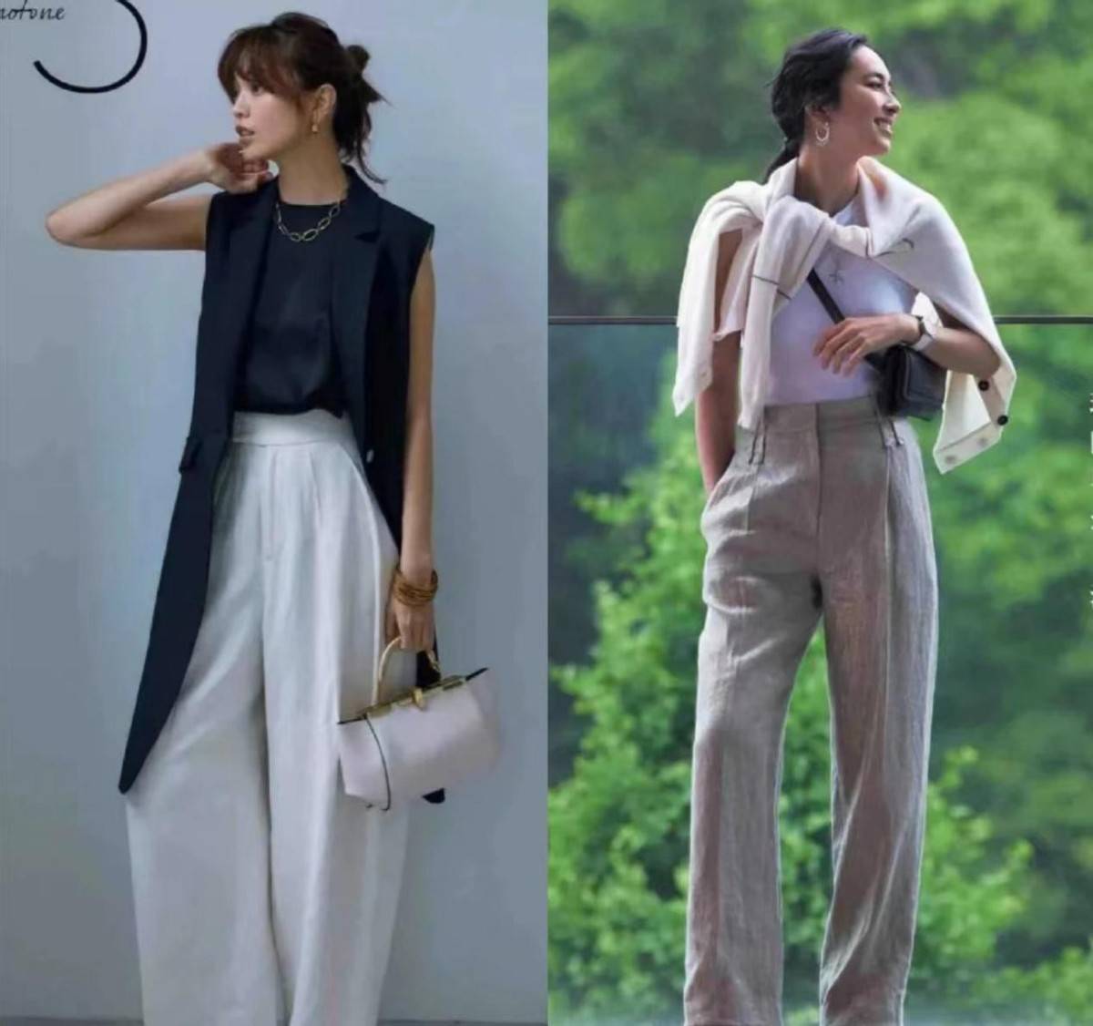 像这两条裤装,它们都是垂感比较好的类型,这样就可以通过面料的包裹,使得双腿的臃肿感瞬间消失,也属于没有搭配禁忌的裤装。随意的采取上衣和它们组合,都不会出错。