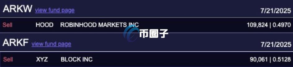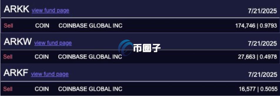 7 月 21 日,方舟投资共卖出 218,986 股 Coinbase (COIN) 股票,总价值 9056 万美元。这笔交易分别通过旗下三只 ETF 完成: