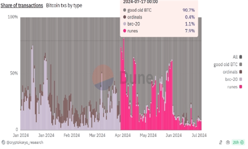 随着 Runes 热度的下降,其他比特币协议,比如 BRC-20 和 Ordinals,虽然还保持着一定的活跃度,但整体交易份额远不及 Runes 的巅峰时期。 7 月 17 日的数据显示,Runes 仅占所有交易的 7.9%,而 BRC-20 和 Ordinals 分别只占 1.1% 和 0.4%。