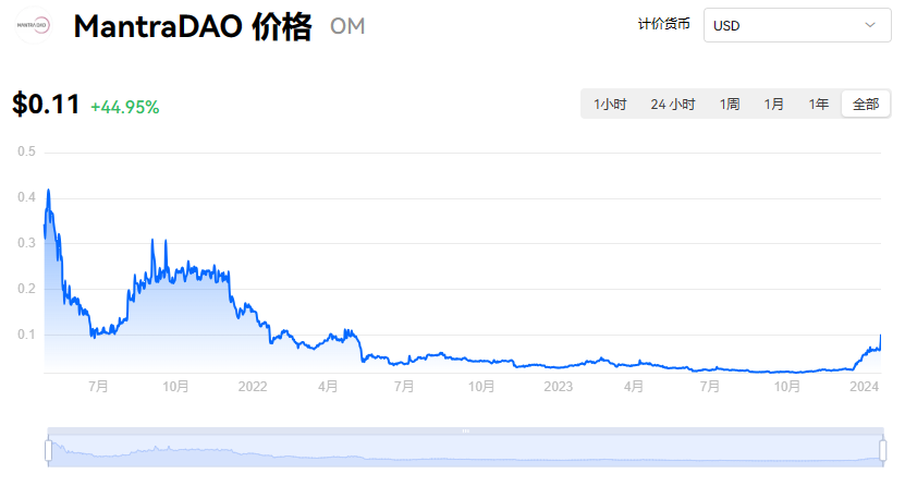截至目前,MantraDAO(OM币)的价格为$0.11。在过去24小时内,MantraDAO的价格上涨了44.95%。目前,MantraDAO在市场上的排名是第520位,市值为$8,019.87万,流通供应量为7.96亿OM,最大供应量为8.89亿OM。我们会持续更新MantraDAO/USD的价格数据。以下是MantraDAO的市场信息: