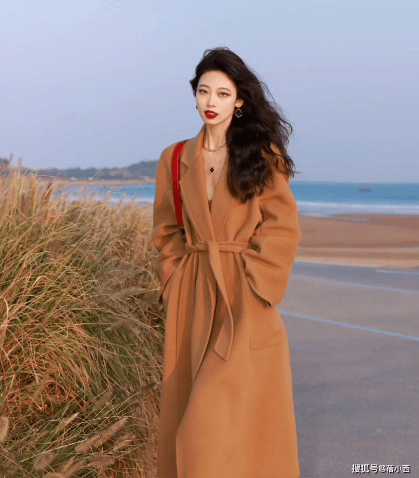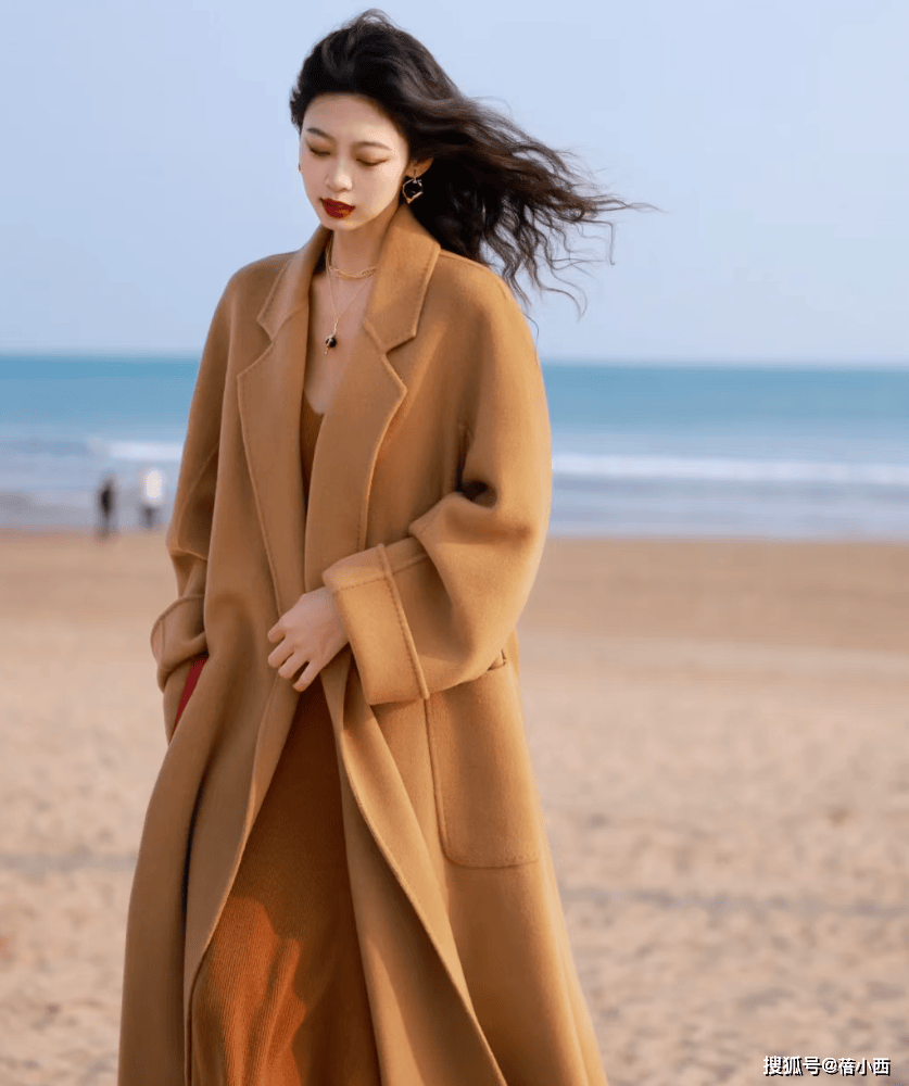 选对大衣和裙子,是这套搭配的“基石”,大衣别盲目跟风选廓形,得按身材来:肩背宽、下半身窄的倒三角身材,挑选A型大衣能悄悄把胯部的肉肉藏住,利落又显匀称。面料上,羊毛或羊绒混纺的优先选,手感细腻还挡风,穿几年都不容易变形,再加上这种经典的驼色耐看不挑人,随便搭都不会出错。