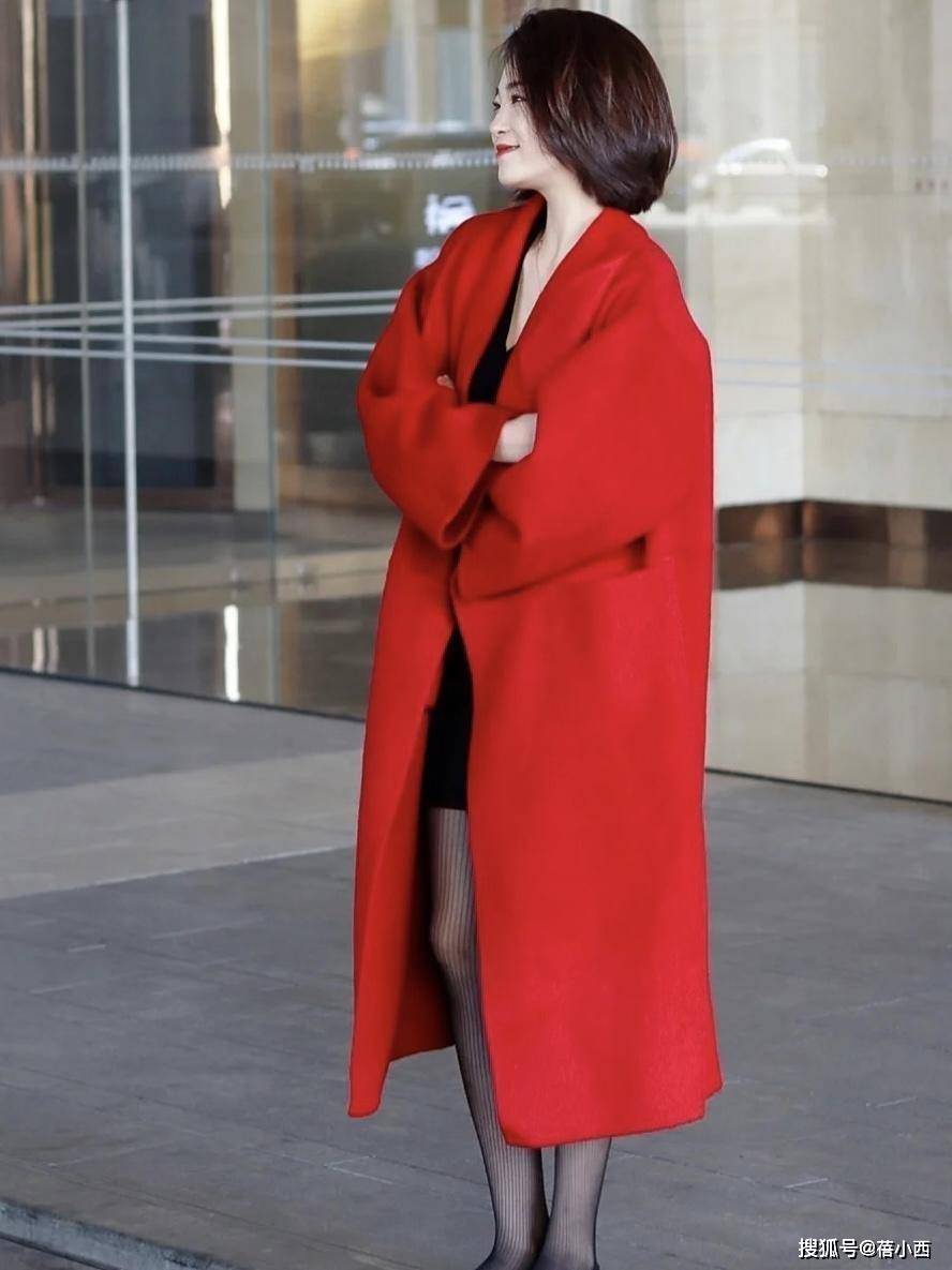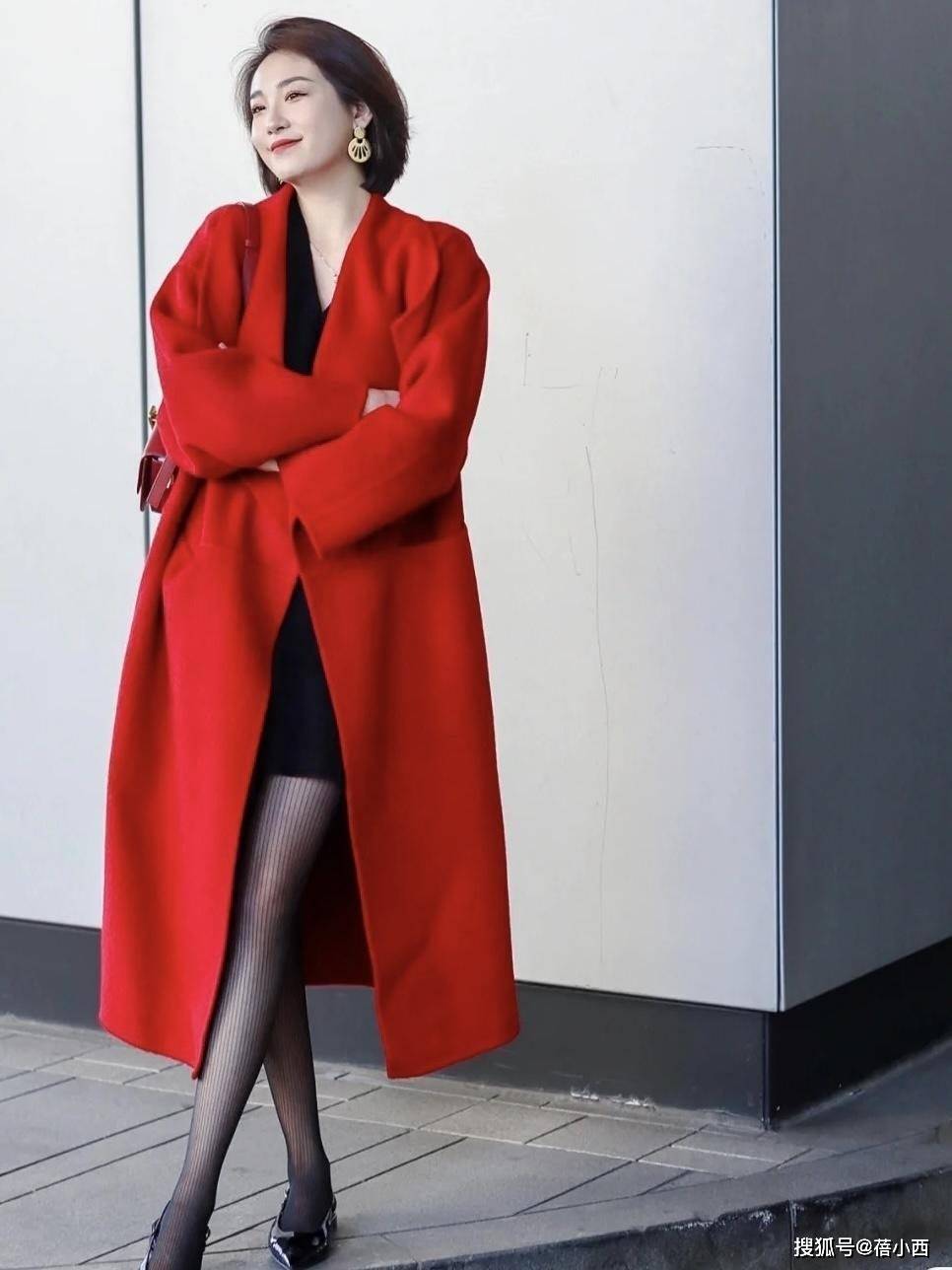 黑红配色永不过时,比如在红色大衣里搭黑色短款连衣裙,露出的裙摆长度刚好在大腿中部,和大衣的长款形成“外松内紧”的对比,再配上黑色细条纹丝袜,细密的纹理增加了精致度,也让性感气质释放出来了,一点都不艳俗。