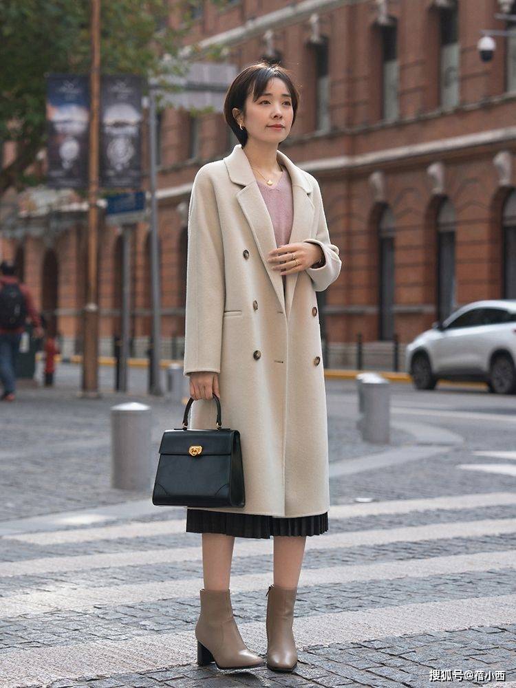 这一身搭配中,米白色的双排扣大衣是整个造型的底色,柔软的羊毛质感裹着恰到好处的松弛感,西装领的线条又添了几分利落,长度刚好落在膝盖附近,既不会压个子,又衬得身形舒展。