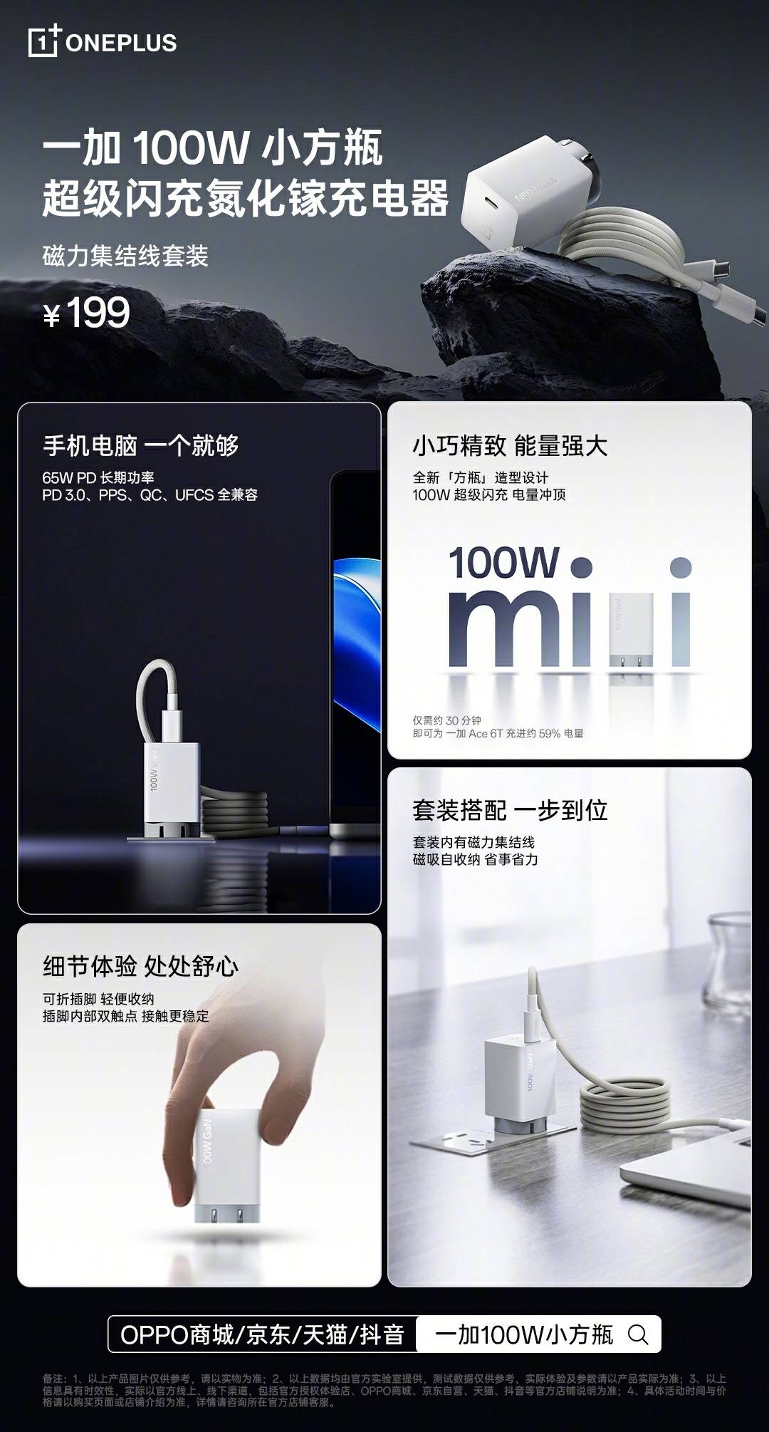 在续航与充电方面,一加提供了两款重量级产品。首先是0W小方瓶超级闪充充电器,这款充电器以“手机电脑一个就够”为口号,彰显了强大的兼容性。它不仅能为Ace 6T提供高效闪充,还能为笔记本电脑等设备供电,并能实现65W的长期稳定功率输出,有效简化了用户的出行装备。