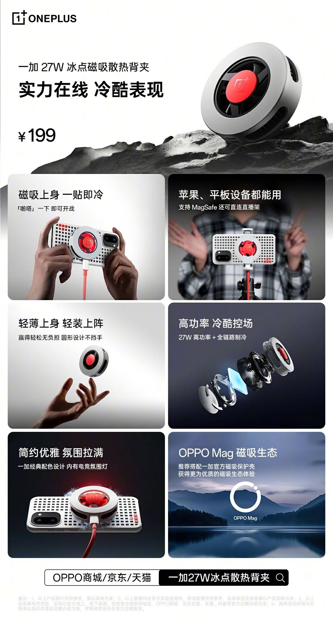然而对于追求极致性能的用户,散热是保障手机持久稳定输出的关键。一加推出了一加27W冰翼磁吸散热背夹,以“小巧轻薄,冷酷控场”为设计理念,通过高效散热技术,可迅速降低手机在高负载时的温度,有效避免性能下降,确保性能充分释放。磁吸设计也保证了安装和拆卸的便捷性。