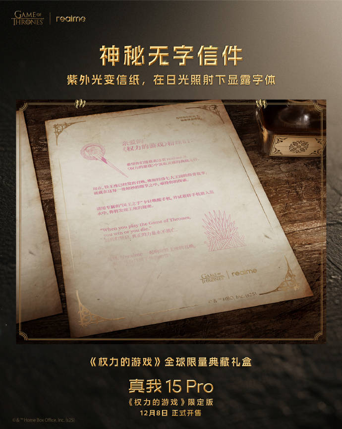 【太平洋科技快讯】12 月 4 日消息,真我官方正式公布了即将发售的真我 15 Pro《权力的游戏》限定版典藏礼盒的详细信息,该礼盒结合经典 IP 元素进行深度定制。