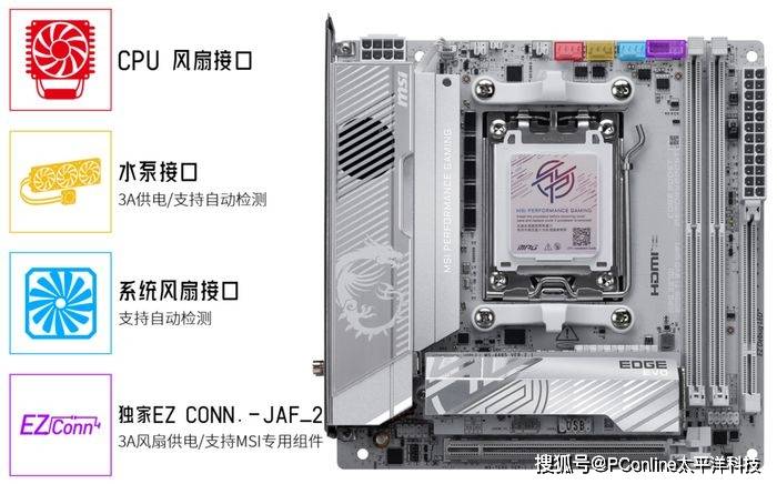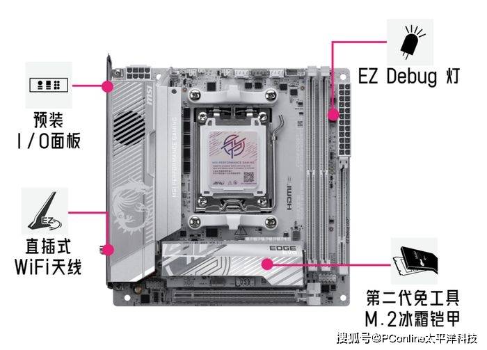 MPG X870I EDGE TI EVO WIFI 延续微星 EDGE 系列的金属质感设计语言,采用冷冽银色散热装甲与白色 PCB 相结合,外观极具辨识度与科技感。在 ITX 狭小空间内仍保持整齐的布局与出色的做工,无论是侧透机箱展示还是低调装机,都能成为视觉焦点。