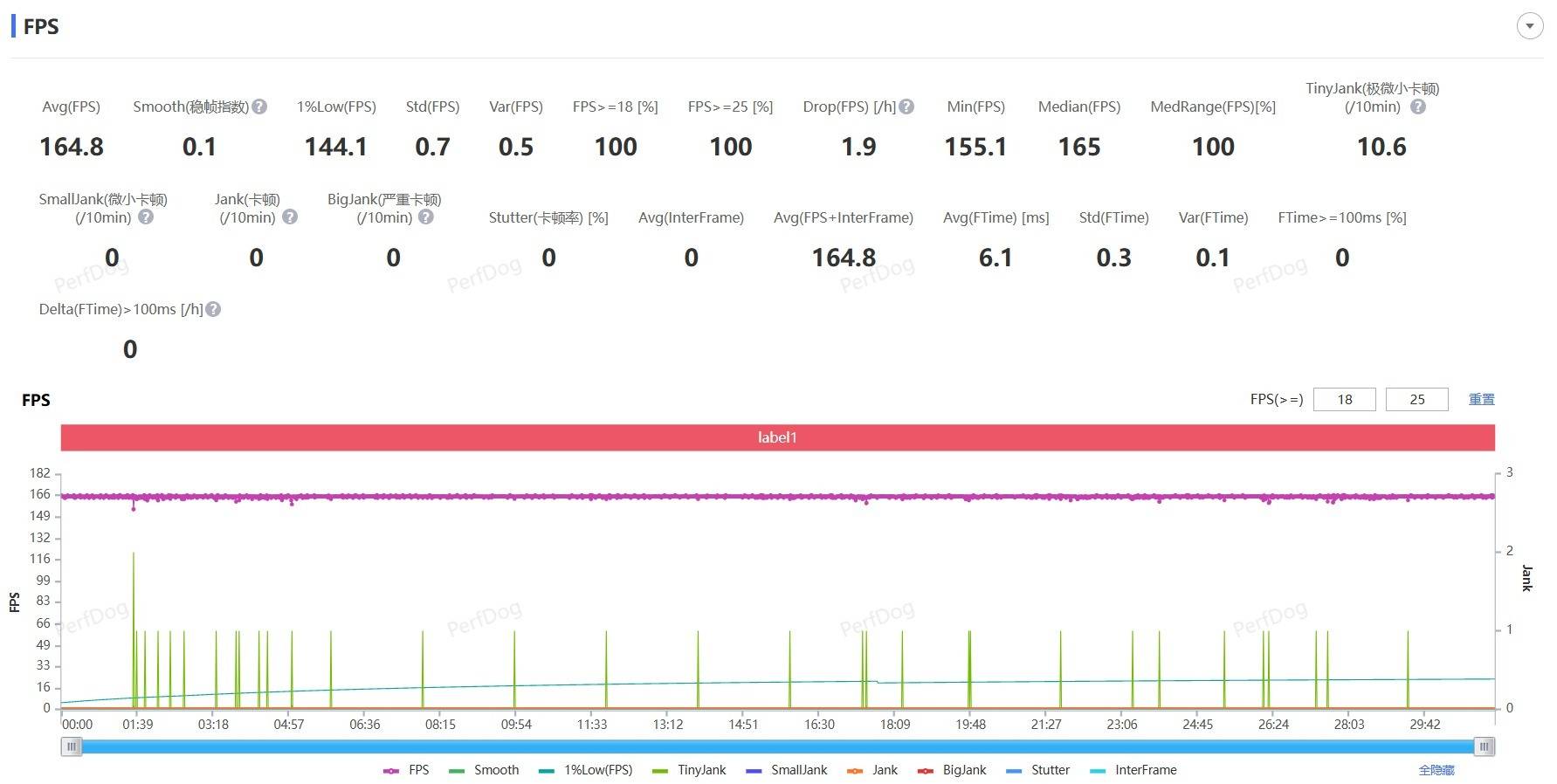 《穿越火线》165Hz高刷模式更夸张,半小时平均帧率164.9帧,玩起来像轻负载游戏一样轻松;
