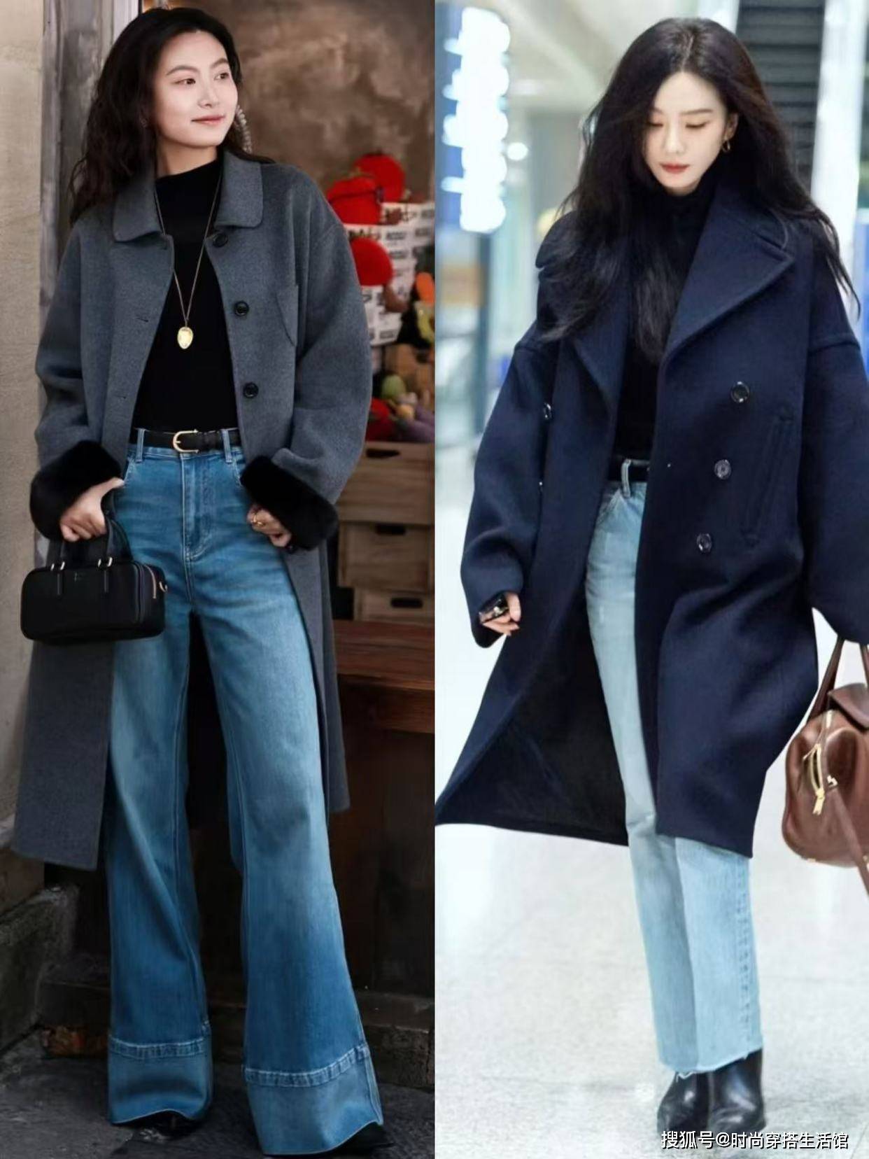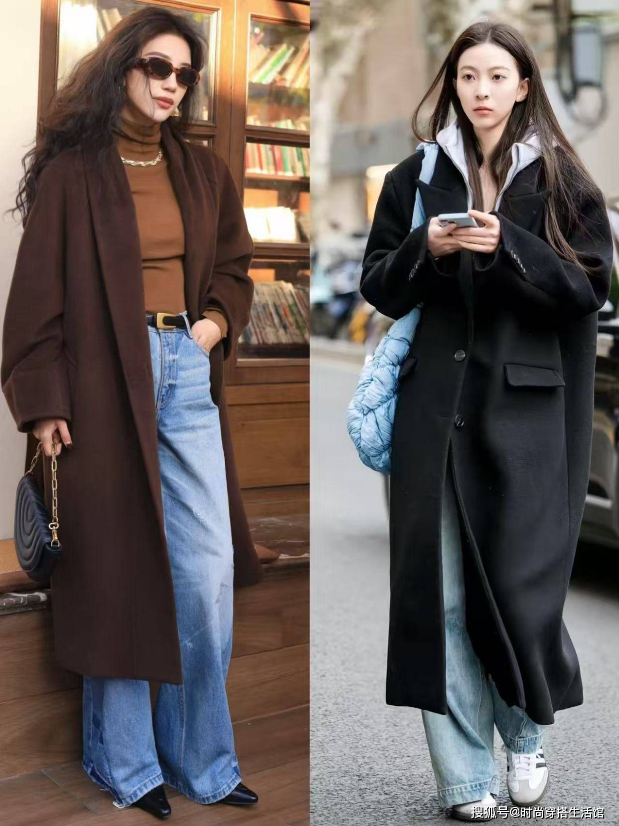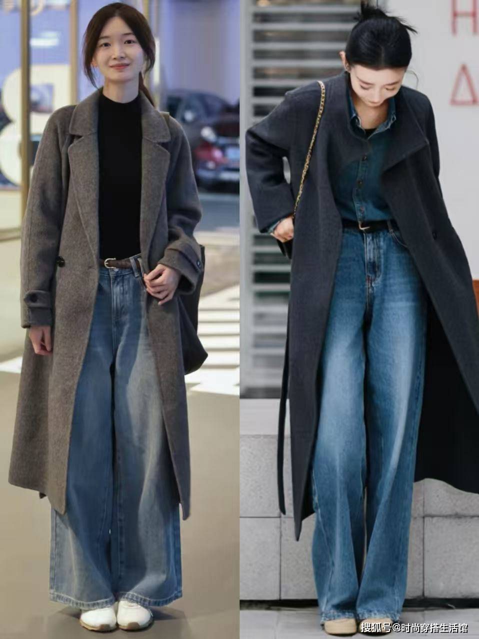 对于微胖女性来说的话,我们选择穿阔腿裤简直就是显瘦利器,毕竟遮肉显瘦真的是一流,同时还能塑造出优雅高级的气场,搭配上宽松的大衣,视觉上更拥有“大女主”的高级格调。如果你是小个子女性担心驾驭不了大衣和牛仔阔腿裤的话,建议大家可以选择过膝不过踝的大衣和九分阔腿牛仔裤,脚上搭配一双运动鞋,轻松就可以拥有大长腿。