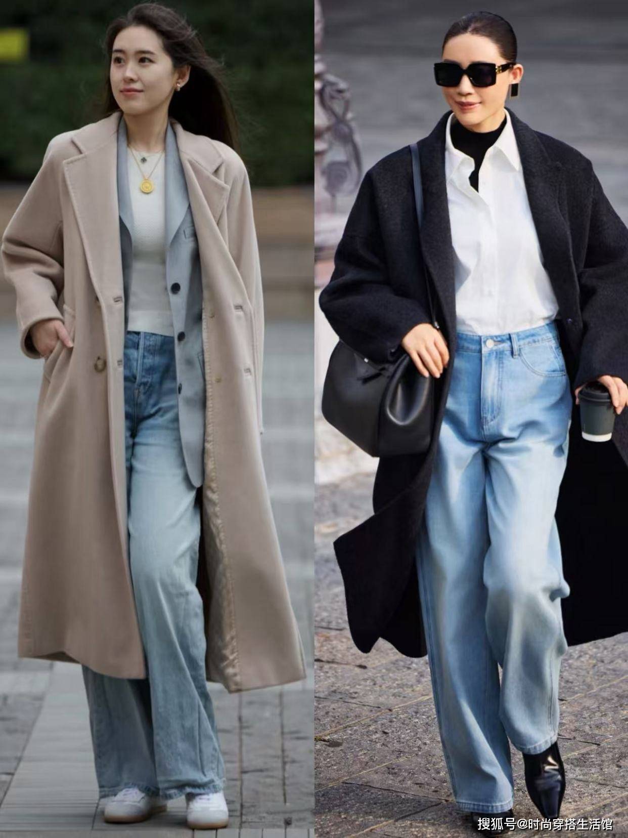 牛仔材质的直筒裤会更加的挺括和舒适,尤其是复古面料的牛仔材质可以弱化大衣的正式感,整个穿搭造型在知性优雅中还不缺失俏皮感,整个穿搭造型的可塑性非常强。