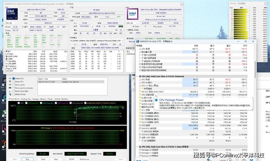 酷睿Ultra 9 275HX在长时间压力下保持在约130W功耗,P核频率维持在4.4-4.7GHz左右。核心温度多次触及100℃红线并触发了过热降频机制。