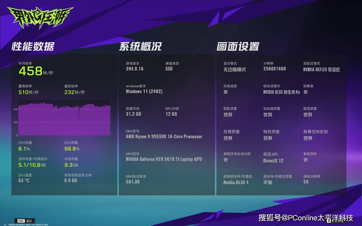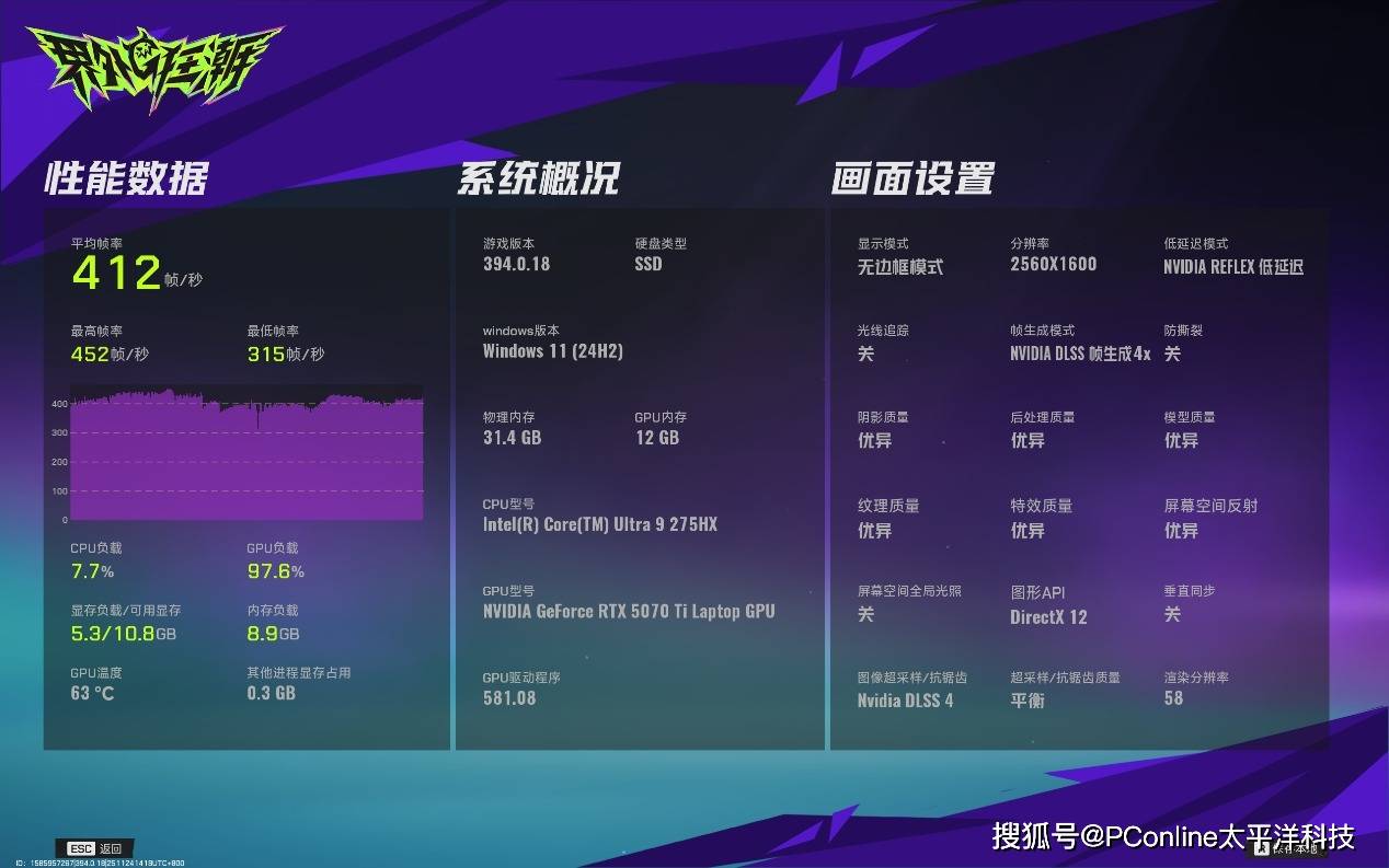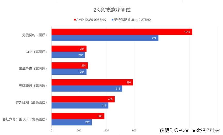 在《界外狂潮》的实测中,在相同配置下,锐龙9 9955HX 的平均帧率为 458 FPS,而英特尔酷睿 Ultra 9 275HX 则为 412 FPS,领先幅度约11%。