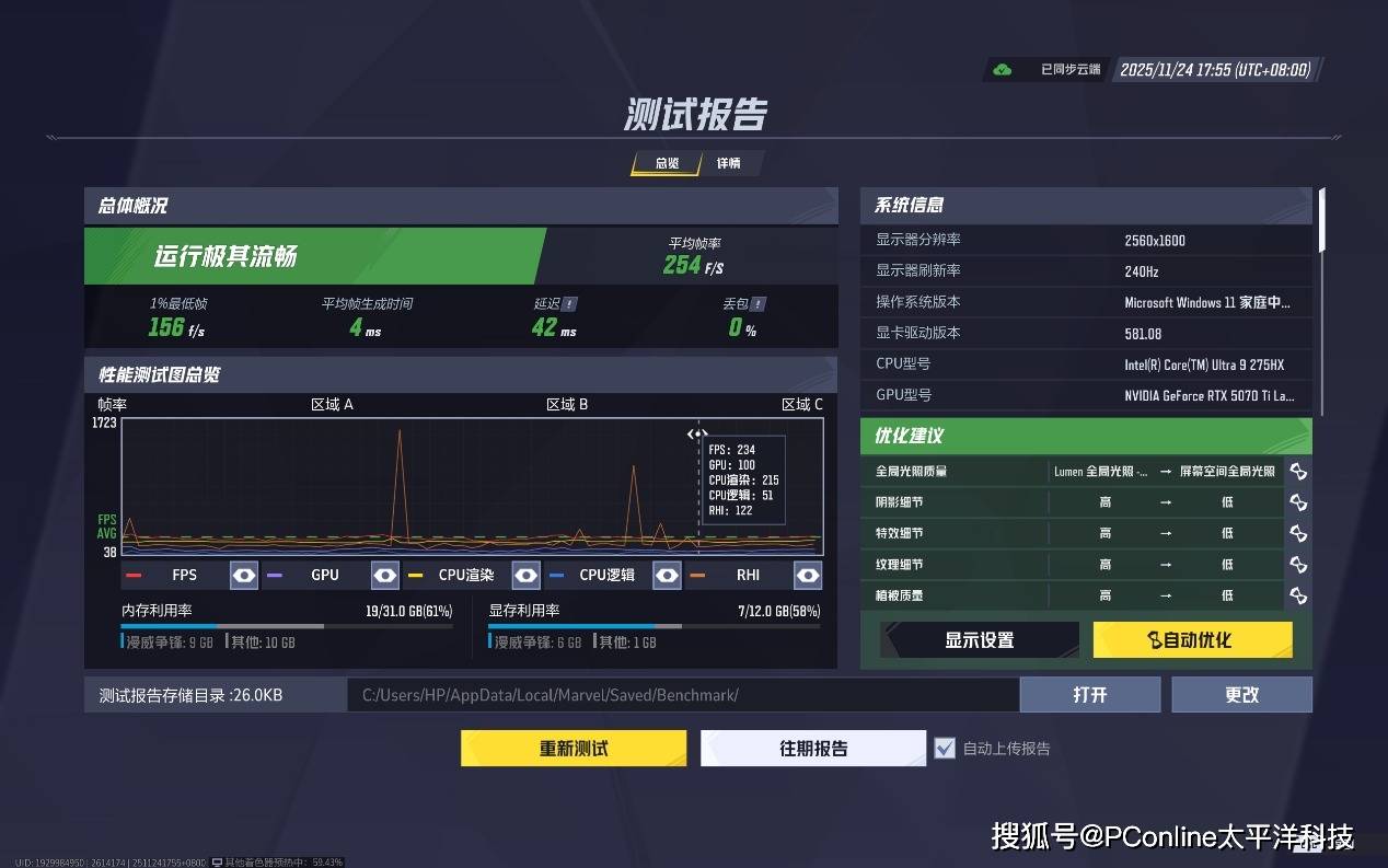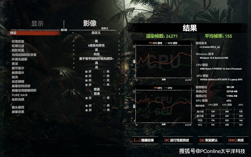 在《古墓丽影:暗影》的内置基准测试中,两台机器都能充分压榨RTX 5070 Ti Laptop的潜力,不过9955HX和275HX的表现还会存在比较直观的差异。在同样开启DX12、DLSS与最高画质的情况下, 9955HX跑出了155 FPS的平均成绩,而275HX为145 FPS,锐龙平台高出酷睿平台近7%。