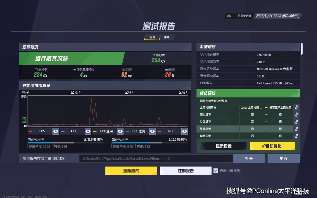 在游戏测试这一环节,锐龙9 9955HX在重度光追与场景复杂度极高的《赛博朋克2077》, 和CPU对线程调度与缓存延迟依然敏感的《古墓丽影:暗影》中,AMD都拿出了不错的成绩,在复杂场景下有更稳定的画面输出。