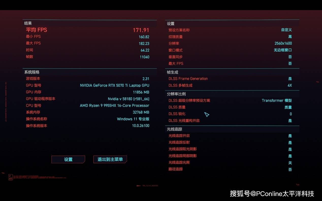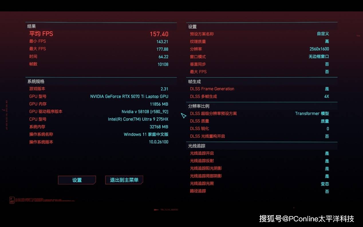 在《赛博朋克2077》中,我们使用2K分辨率、开启帧生成和光追特效的条件下进行了测试。