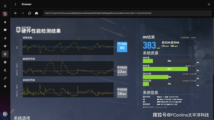 来到《彩虹六号:围攻》,吃帧率、也依赖CPU调度效率,9955HX的优势放大,在相同显卡和统一画质设定下,9955HX交出了383 FPS的平均帧数,而275HX则为292 FPS。