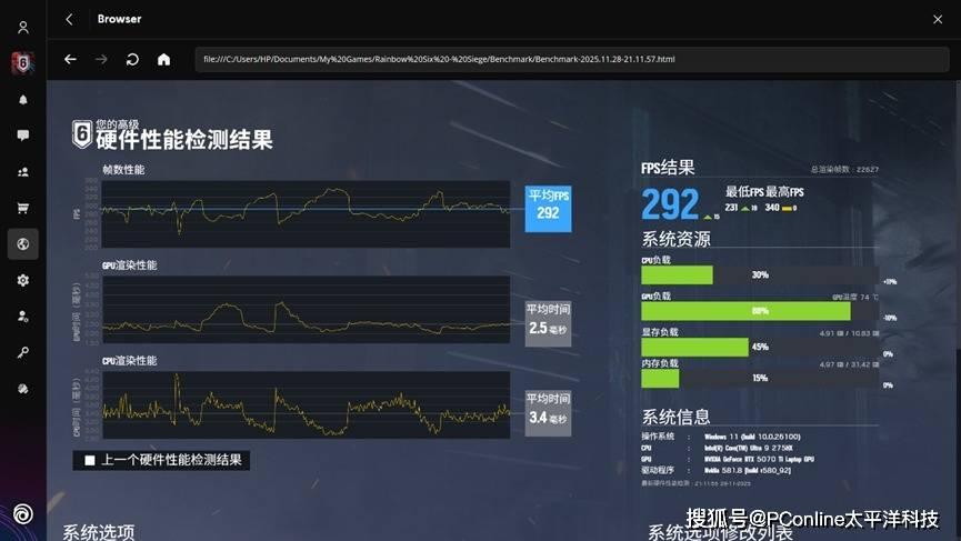 可以看出,游戏进入CPU与GPU并行渲染的阶段,Zen 5的指令吞吐与调度效率就能减少显卡的等待时间,让GPU始终以更接近满载的状态运行,帧率自然更高也更稳定。而275HX也依然是一颗性能强悍的旗舰级处理器,差异在于,在同功耗与同GPU组合下,AMD平台的输出效率更高。追求流畅操作、稳定帧数,以及更低输入延迟的电竞玩家可以考虑选择锐龙平台游戏本。