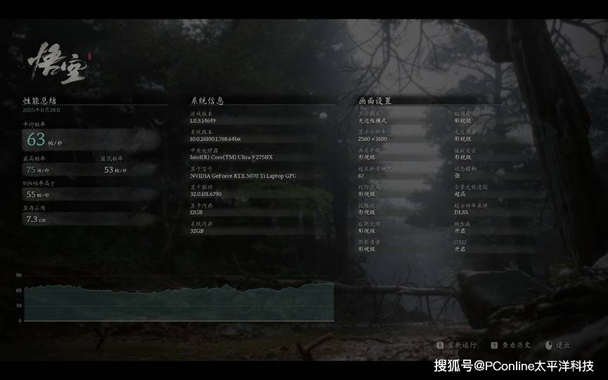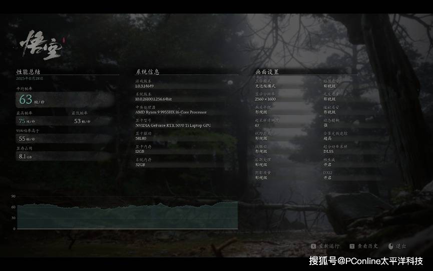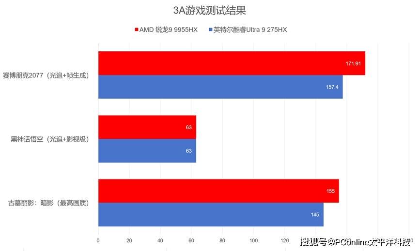 《黑神话:悟空》是一款对GPU与CPU 都有明显负载的综合型3A大作,尤其在影视级、DLSS与光追同时开启的场景下,对整机调度能力是一场全方位考验。两台设备最终给出的成绩非常接近:锐龙9 9955HX与酷睿Ultra 9 275HX的平均帧都稳定在63 FPS,整体游玩流畅度无明显差异。